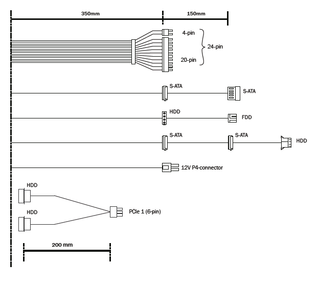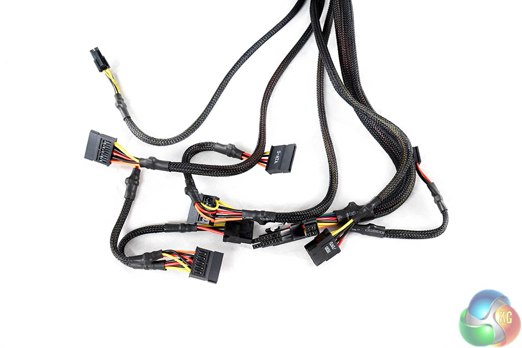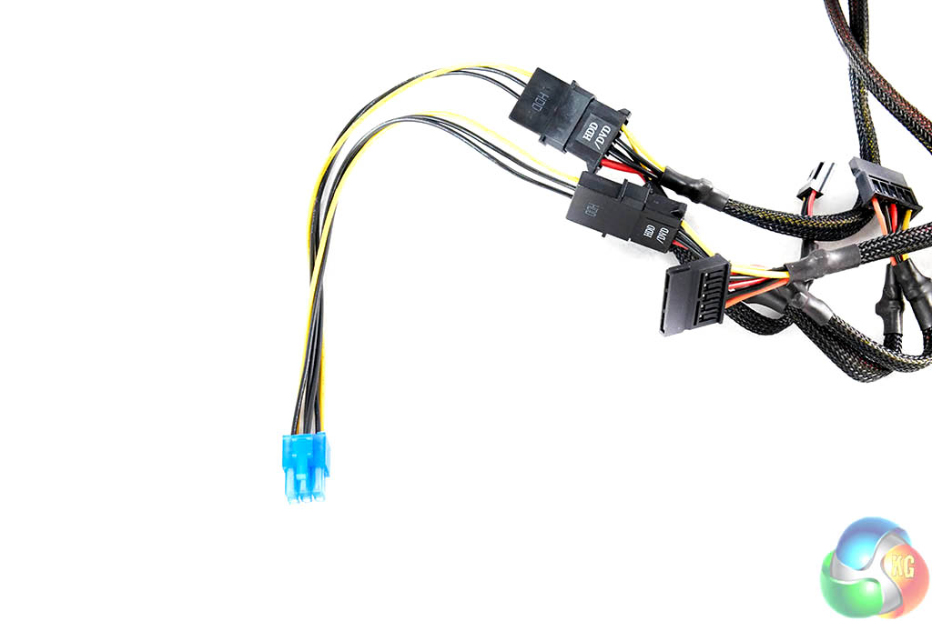 All of the cables are hardwired, although there aren't that many due to the nature of this particular design. The PCI-E cable connects to two of the standard Molex connectors for power.