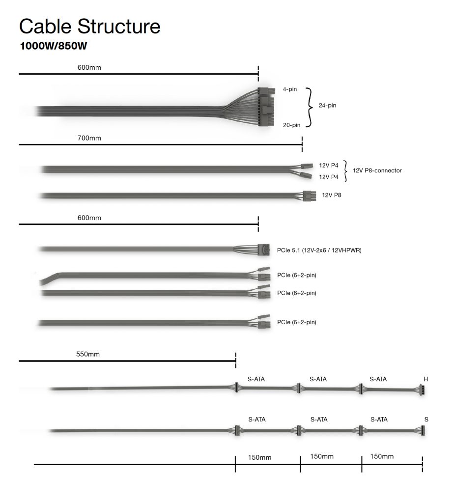 The cable quality is good and there are no in cable capacitors either. The gauge varies between 15-18AWG for the SATA and EPS12V cables. With the ATX connector a 16-22AWG gauge. The 12+4 Pin PCIe connector is 600mm long with a 600 watt rating and its 16-26AWG Gauge.