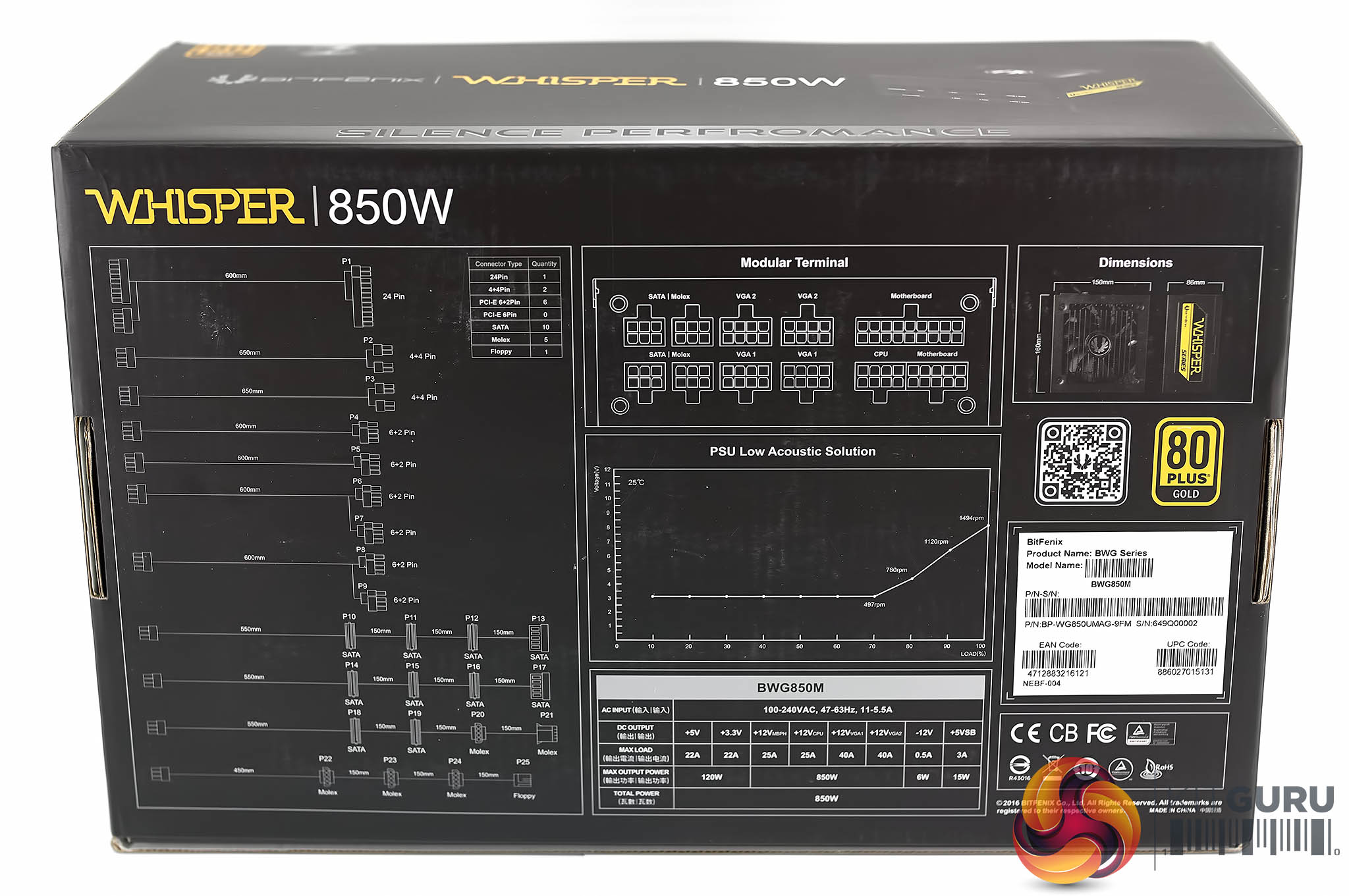 The rear of the box focuses on some of the technical aspects including fan speeds/noise levels, the modular connector panel and a diagram of the cabling.