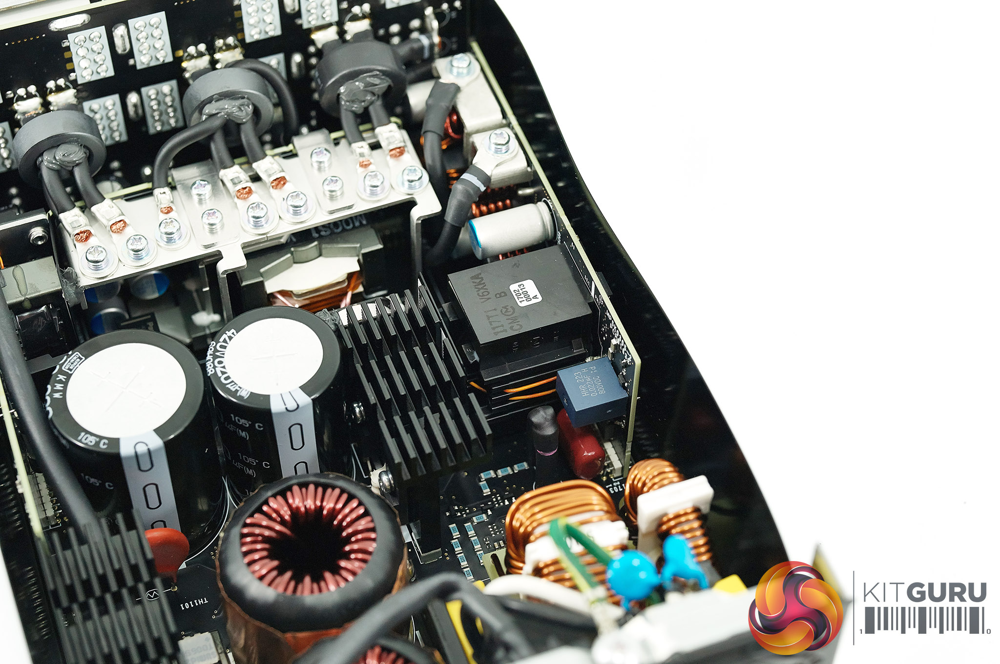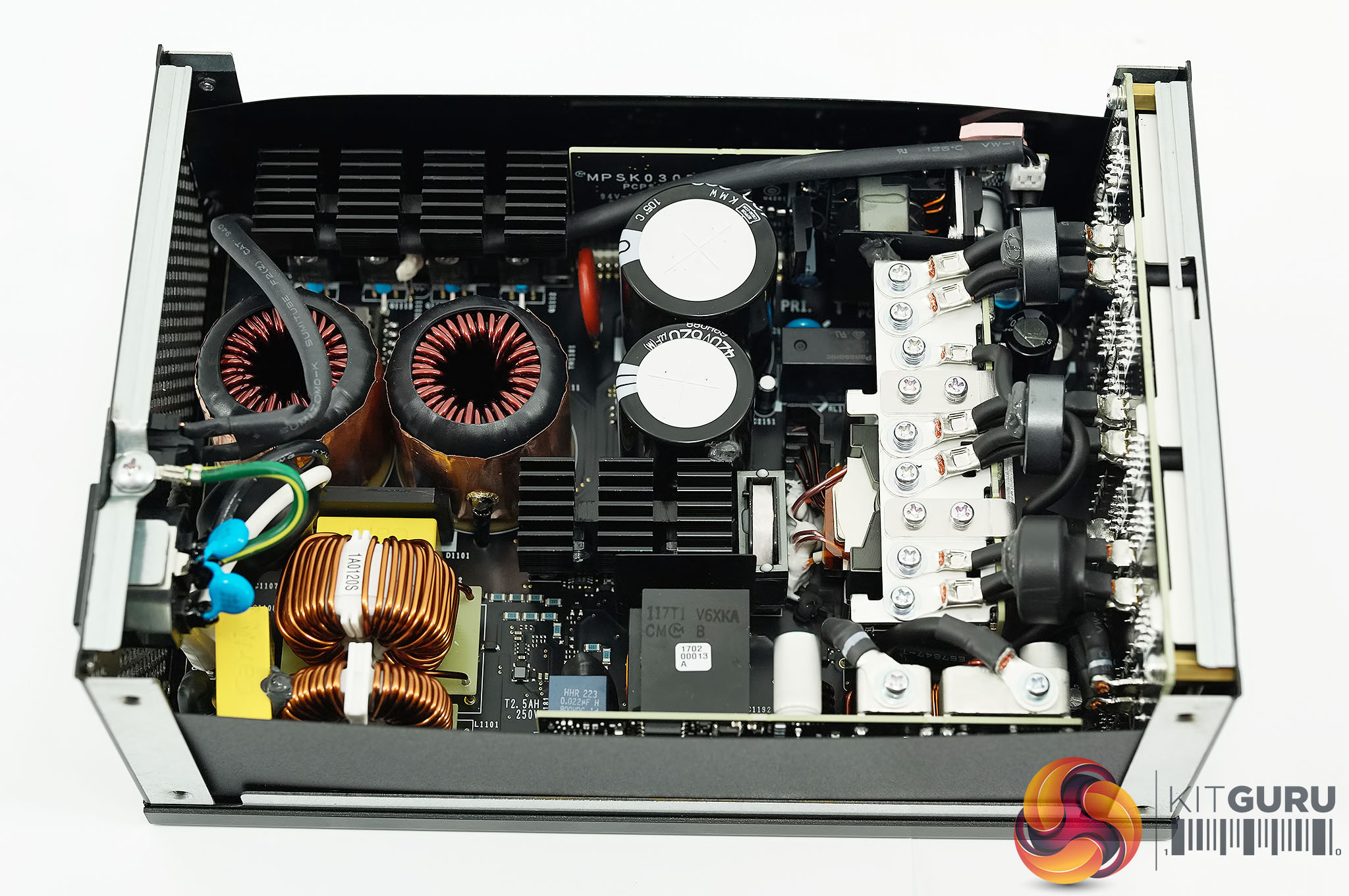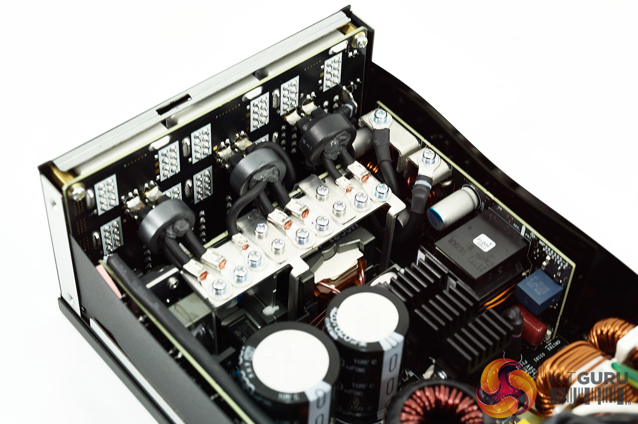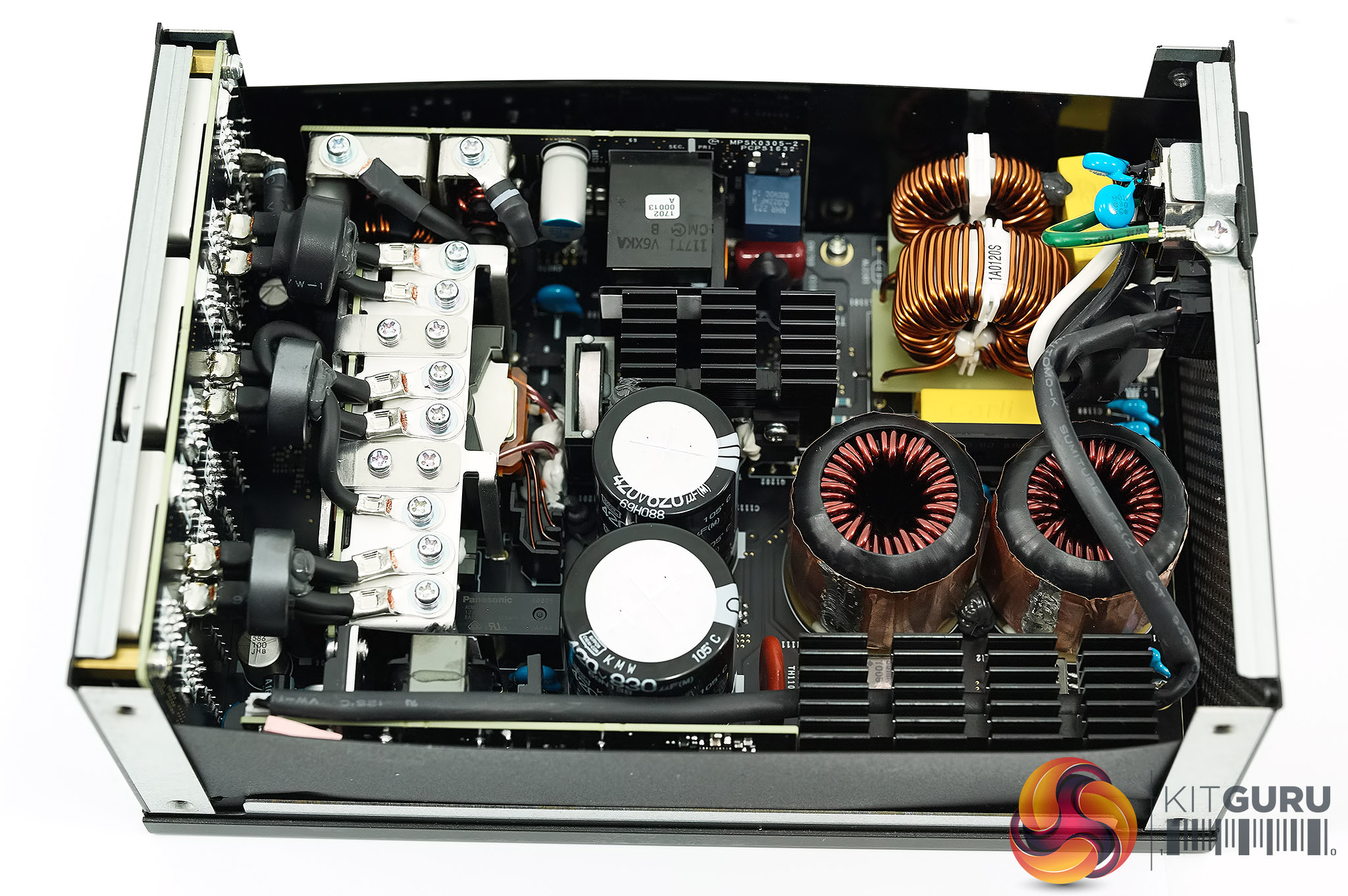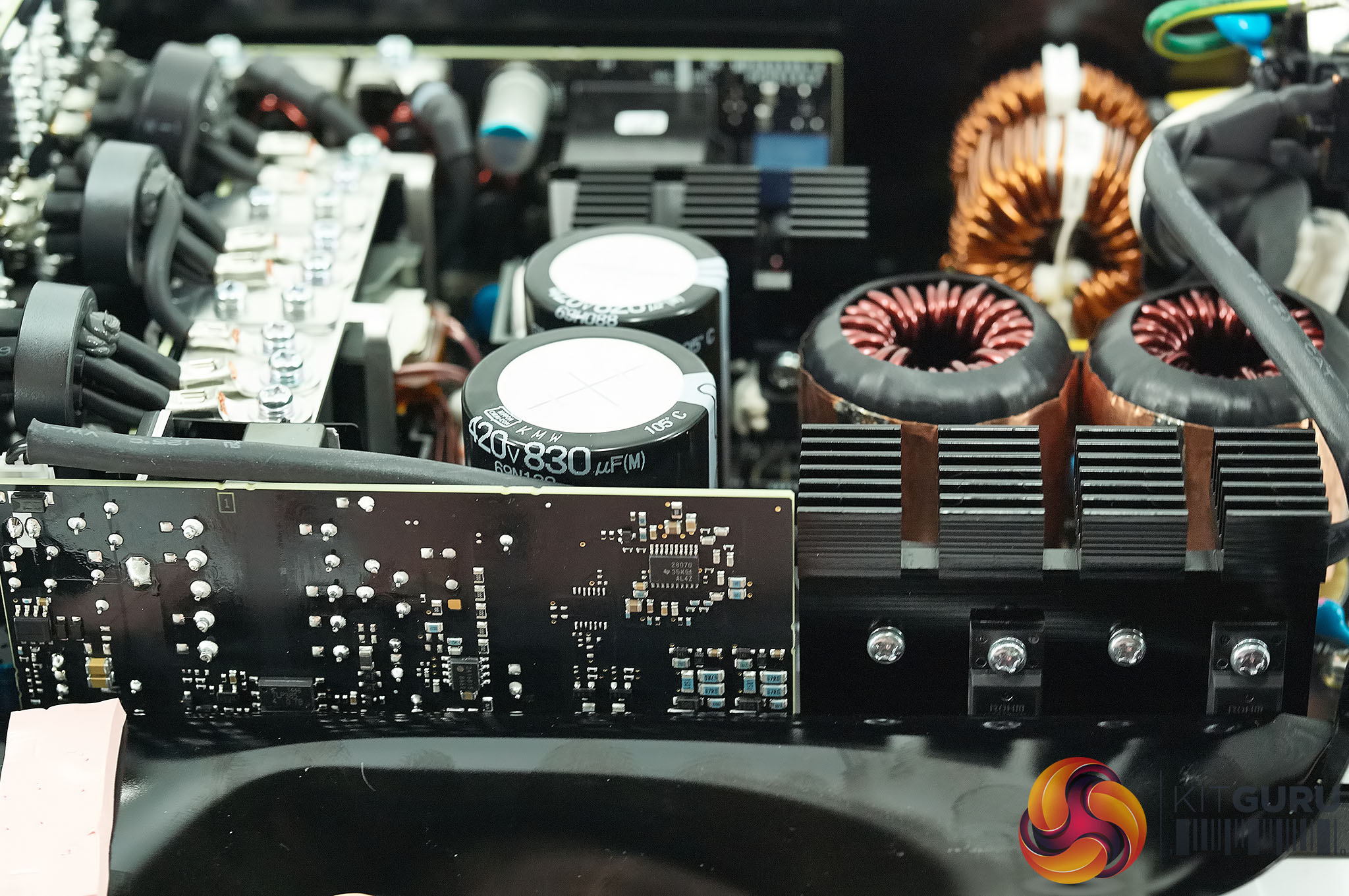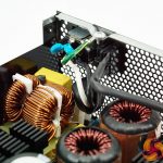 Power supply transformers generally use copper wire coiled around a ferrite core. For this MasterWatt Maker 1200 MIJ Murata came up with the idea of using thin sheets of copper stacked on top of each other with a very thin layer of insulation between them. Cooler Master say this is uniquely used in this power supply. In the case of PFC MOSFET's – Infineon's CoolMOS C7 series is used throughout – these are expensive, as much as four times more compared against a traditional MOSFET.
