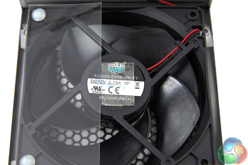 Cooler Master are using a 120mm fan (A12025-25RB-2IN-F1). This Chinese fan is rated 12V 0.16A and we know the 15RB in the same series is actually a tuned Delta rebrand. This new 25RB fan is rated to produce 52CFM airflow at a maximum speed of 2,500 rpm. Noise levels are officially rated to 29.7dBa. It uses an LDB bearing.
