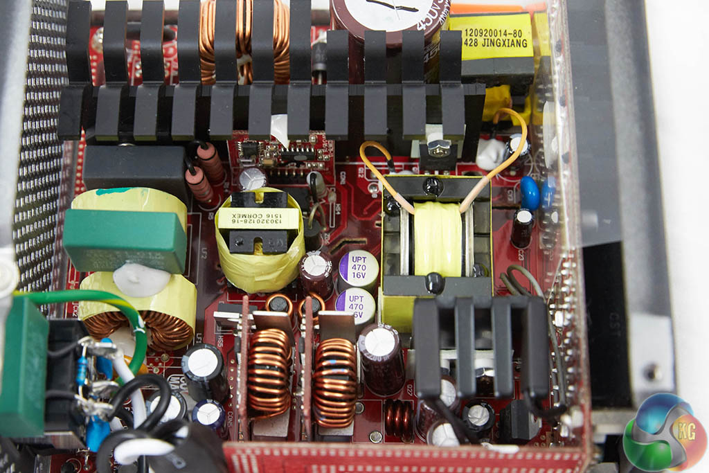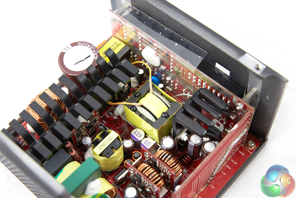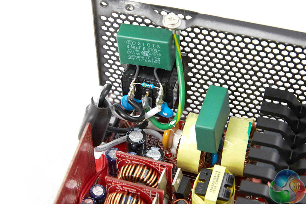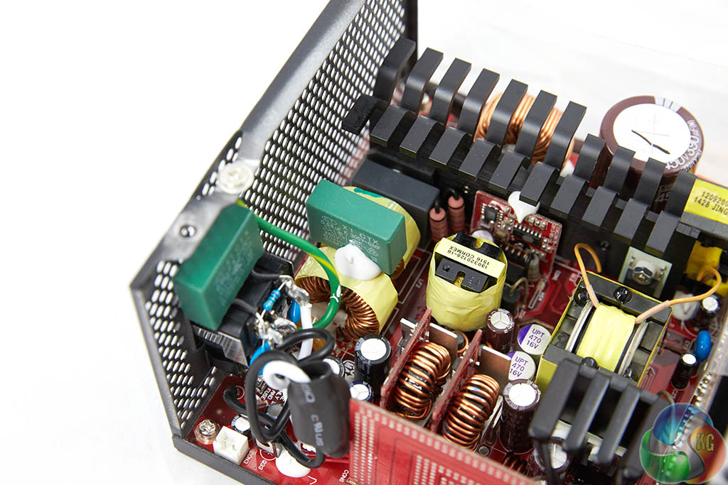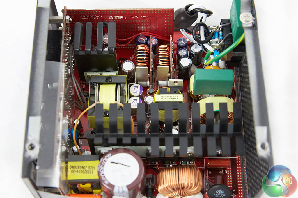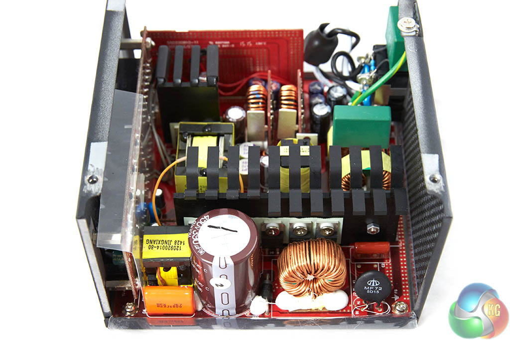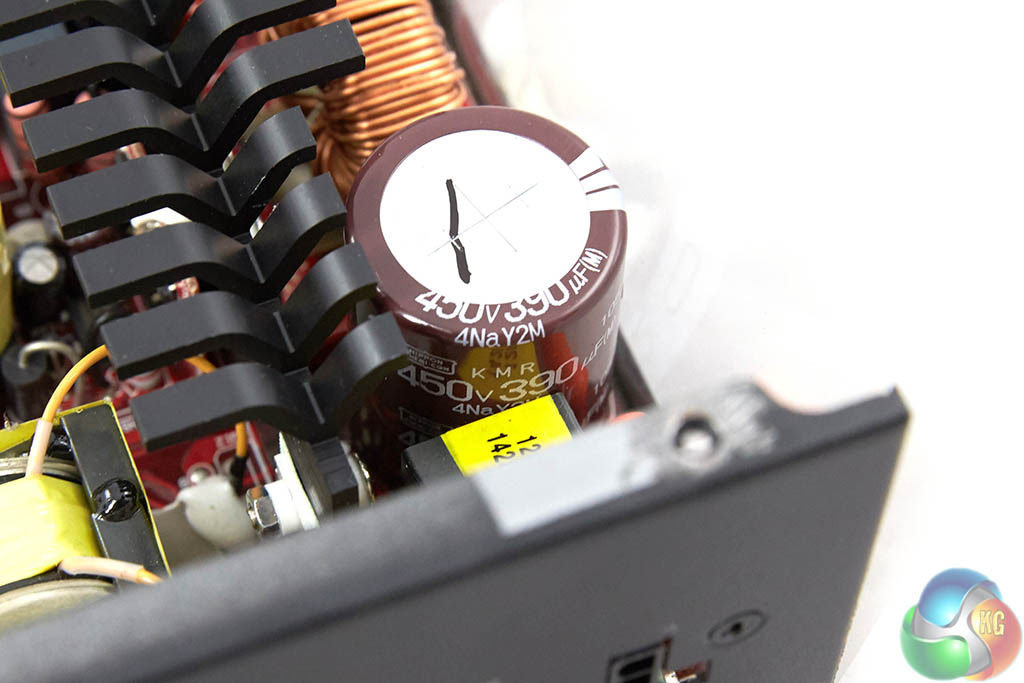Soldering quality is high throughout and the design offers full OVP/UVP/OPP/OTP/SCP protection. The primary capacitor is a high grade Japanese 105C KMR model from Nippon Chemi Con – rated 450V 390uF. Secondary capacitors are also Japanese branded, which is reassuring.