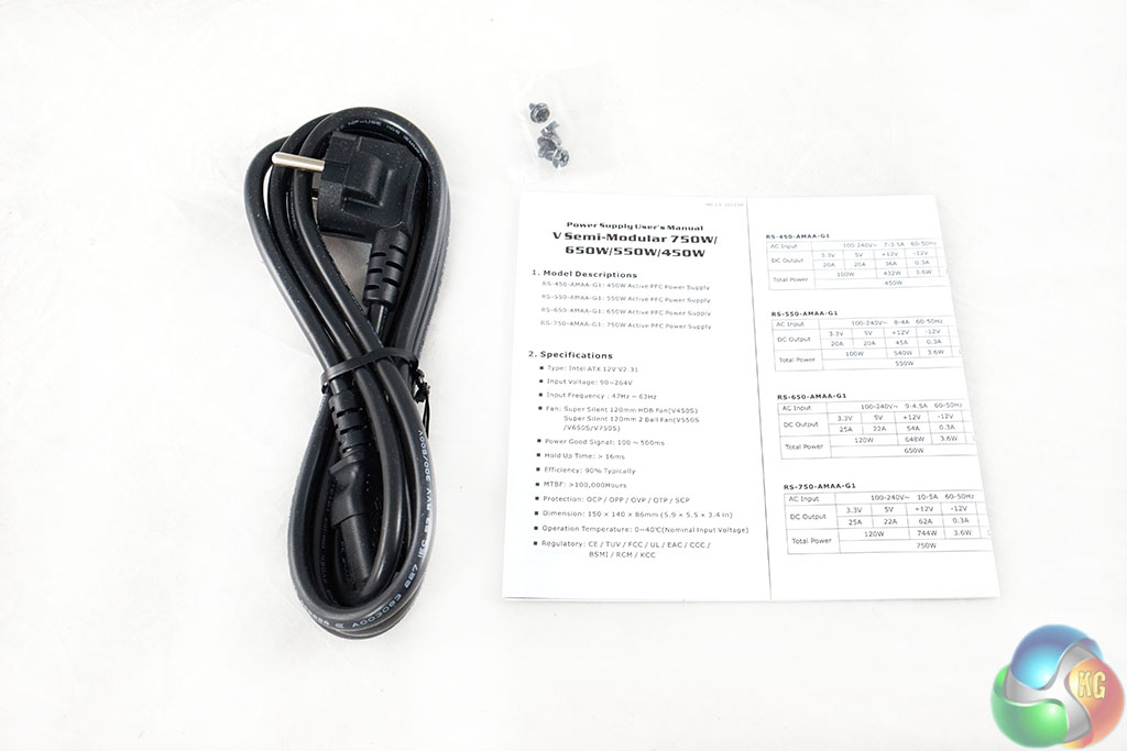 A user manual, regional specific power cable and mounting screws round out the accessories.
