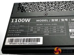 The power supply can deliver 20A on +3.3V and +5V rails. The +12V rail can output 91.6A for a total of 1099.2 watts.