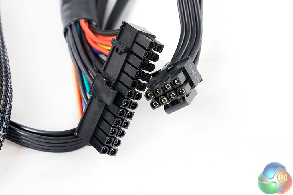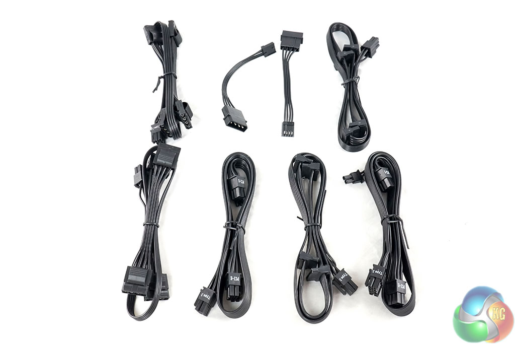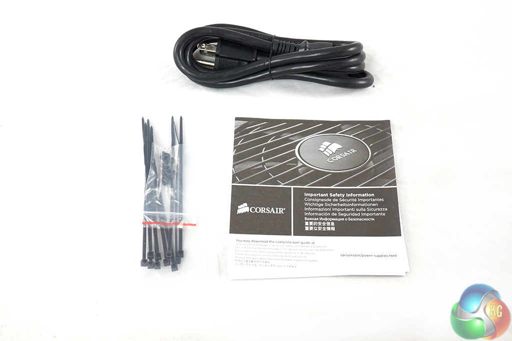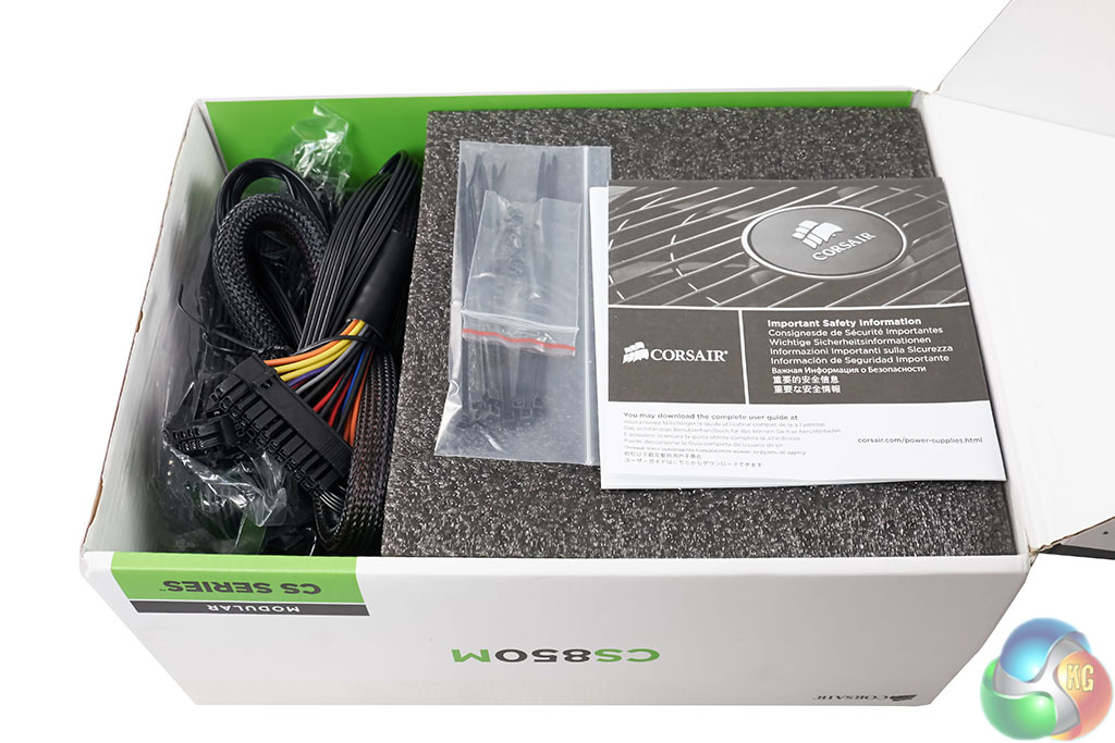 The modular cables are stored in one side of the box, with the power supply itself protected between two thick pieces of foam. Cable ties, mounting screws and a user manual rest on top.