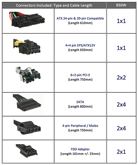 The diagram shows the breakdown of cabling with the unit. The CS850M supports two high end graphics cards if you want to run in Crossfire or SLI. It is good to see a reasonably long 650mm 4+4EPS/ATX12V cable supplied. A total of 8 SATA connectors are available, across two cables.