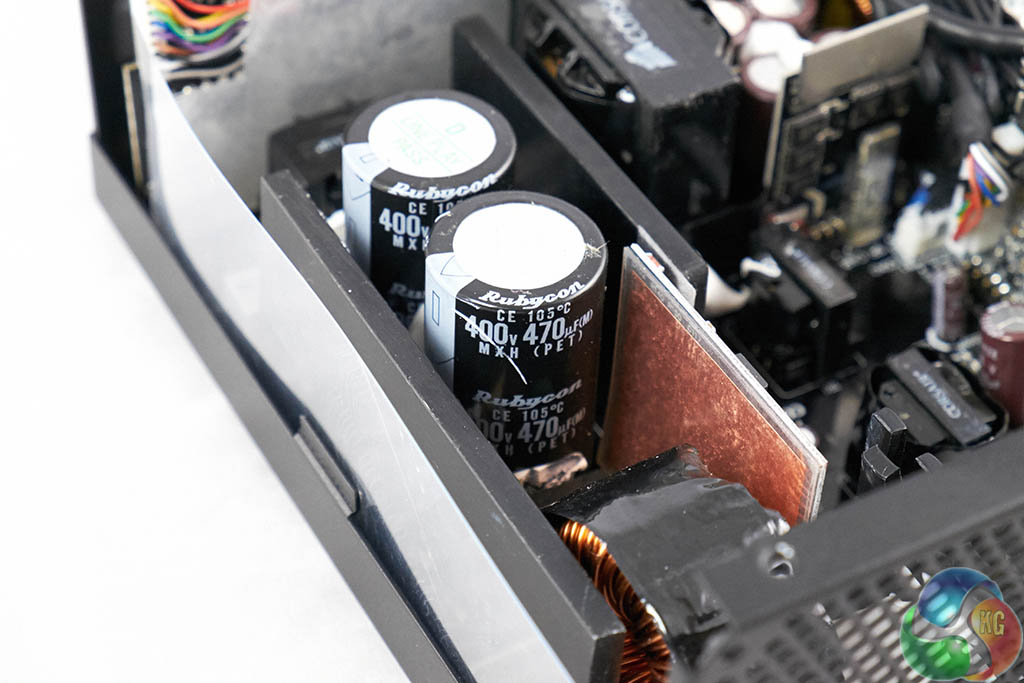 The design is using high grade 105c Japanese rated capacitors throughout. Primary capacitors are from Rubycon, the finest quality that money can buy. Interesting to see that while Seasonic use three 330uF 420V capacitors in their latest 1050WXP3 unit, Corsair are using two 400v 470uF capacitors in the HX1000i.