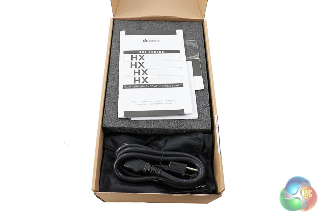 The Corsair HX1200i power supply ships protected inside thick slabs of foam, with the accessories shipping in a separate section of the box.
