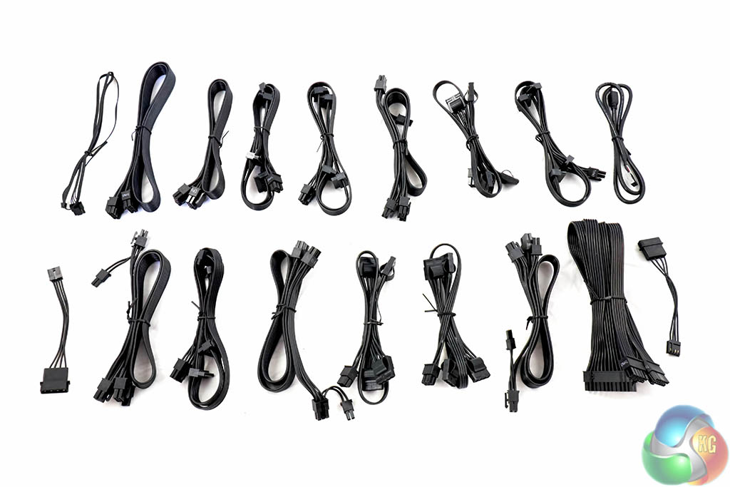 The Corsair HX1200i has a total of 8 PCIe connectors available – for those running high end SLI and Crossfire configurations. The lower power 750W and 850W HXi models sacrifice two of these connectors. The cable configuration is identical actually to the HX1000i model, with the exception of 16 SATA cables (HX1000i has 12 in total).
