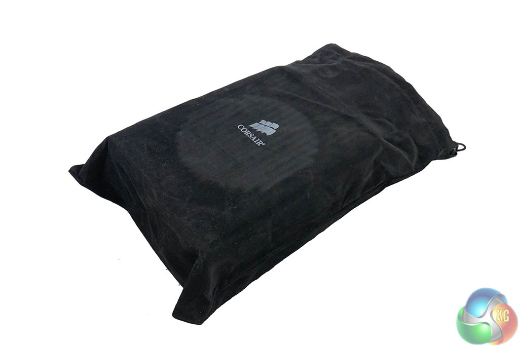 Corsair include a regional specific power cable, a user manual, some literature and mounting screws. The power supply itself is wrapped inside a soft felt bag.