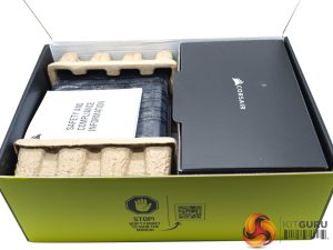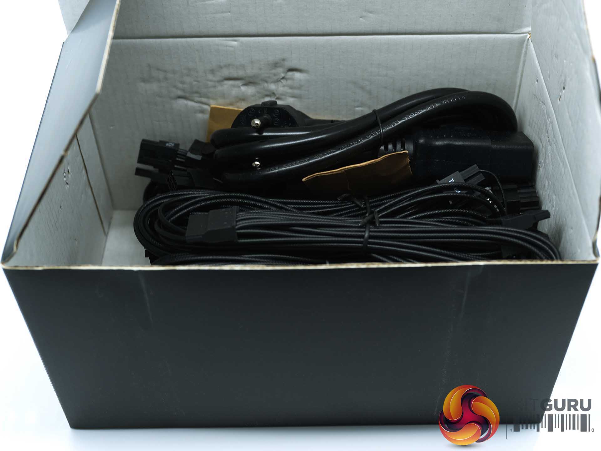Inside, the box is split into two sections. The power supply is shipped sandwiched between two blocks of cardboard. The cables and accessories are in a black box taking up half the space on the right side.