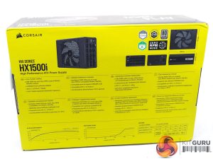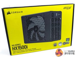 The HX1500i ships in a distinctive bright yellow box with key information on the front, such as the Cybenetics Platinum Certification, ATX 3.1/PCIe 5.1 compatibility, the iCue capabilities, 10 year warranty and support for the latest Nvidia 50 series graphics cards.