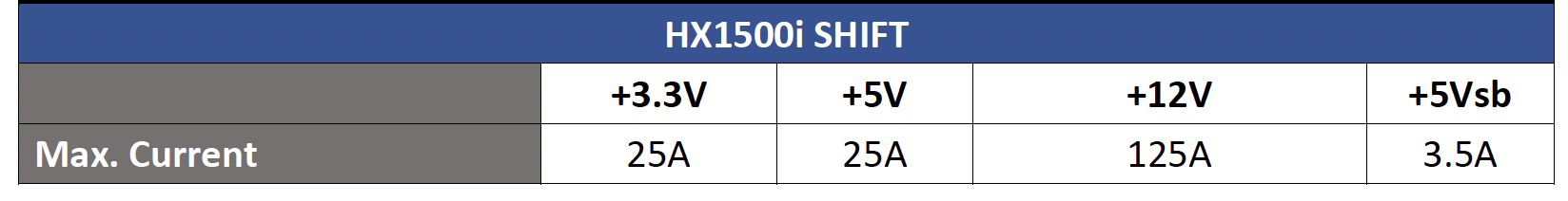 The HX1500i Shift can deliver 125A on the primary +12V rail, and 25A on both +3.3V and +5V rails.