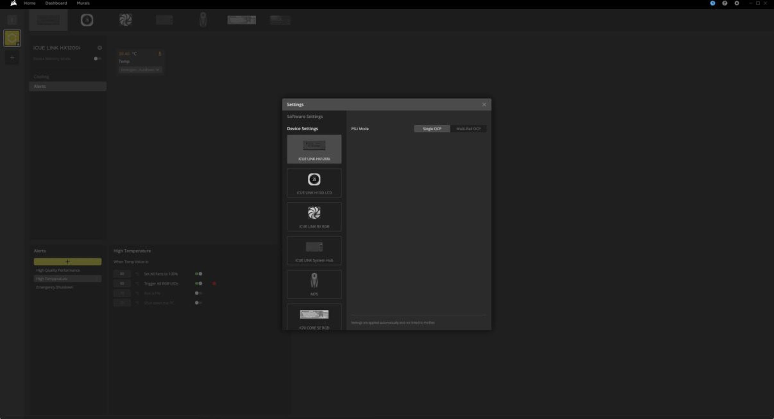The HXi Shift can use iCUE software to monitor power settings, toggle between single and multi rail overcurrent protection (OCP) on the fly, or to create custom fan profiles.