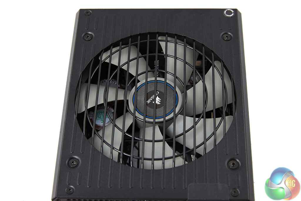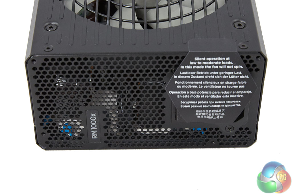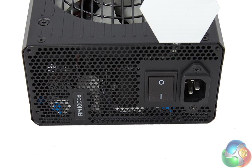 One side of the power supply is vented to help with heat dissipation and air flow. A power button and connector are positioned at the side. Corsair place a sticker over the cable connector to alert the user that the fan is not likely to spin at idle to moderate loads.