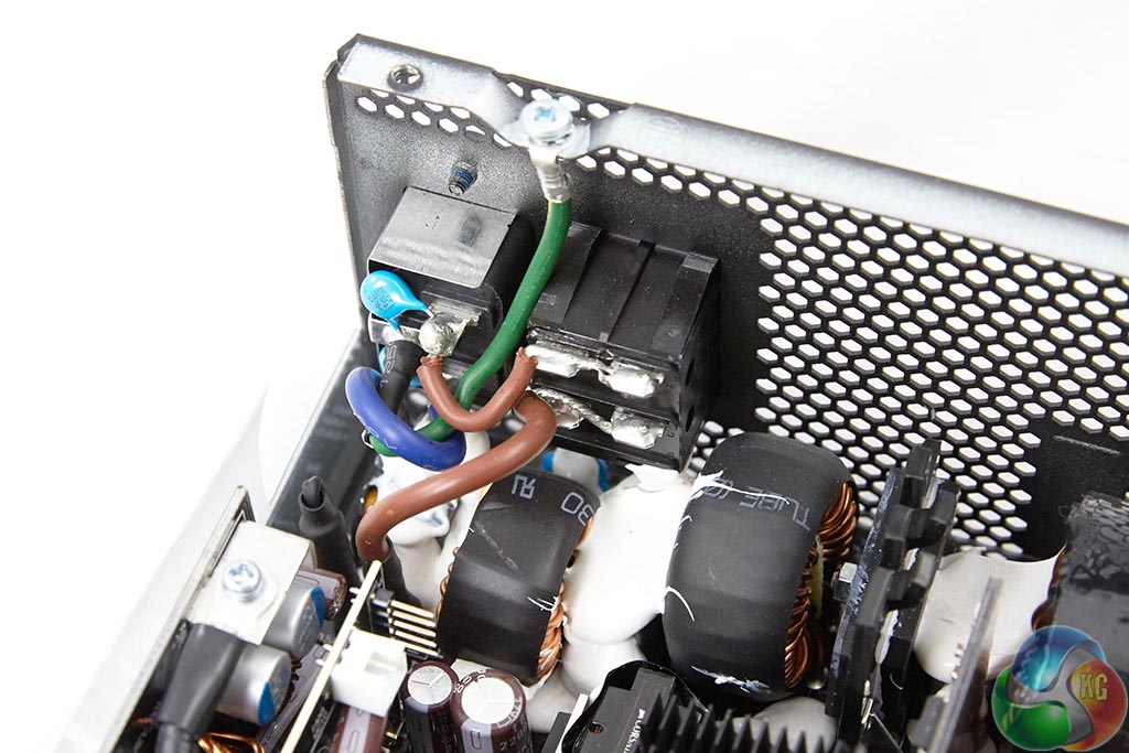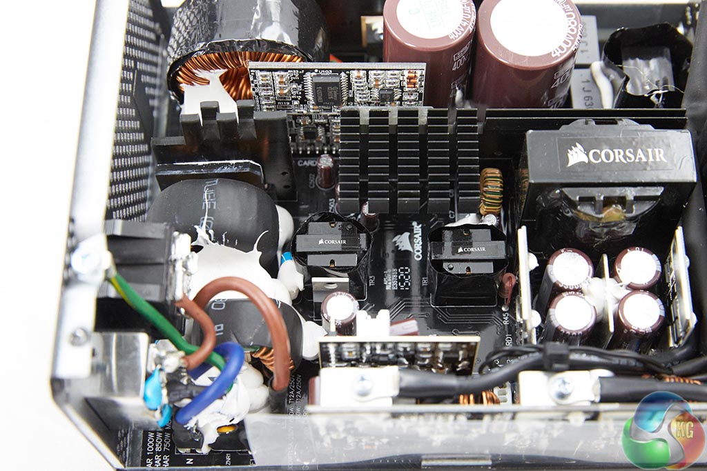 Corsair are using 105c rated Japanese capacitors on both primary and secondary stages. In the primary stage there are two different sized KMW series Nippon Chemi Con capacitors – one is rated 400v 680uF and the other 400v 470uF. This brings the total to 1150uF.