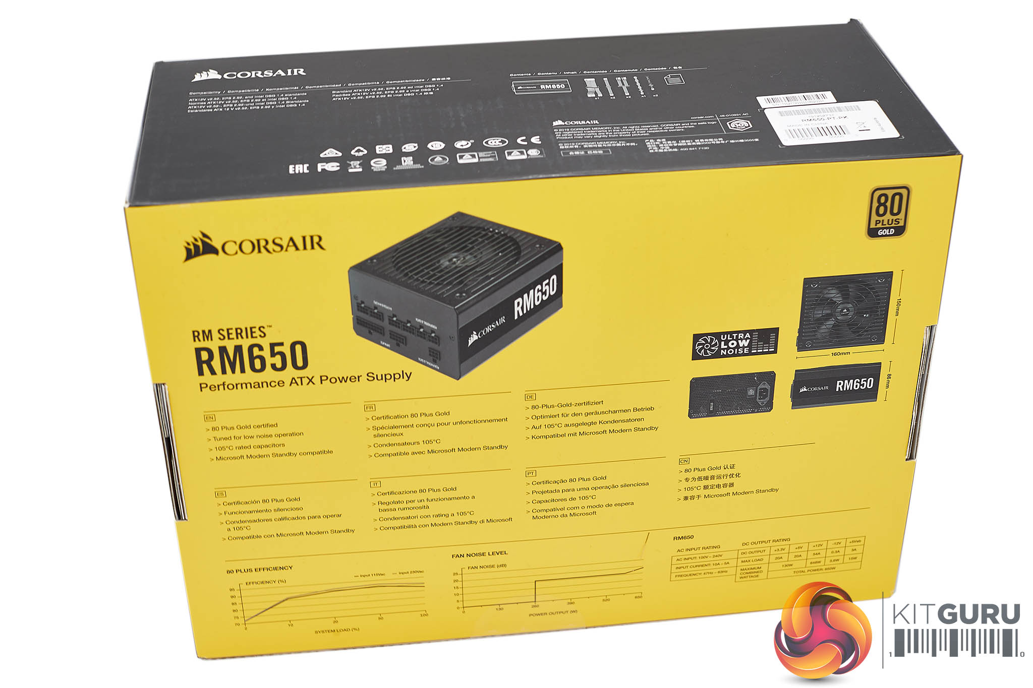 The bright yellow background continues around to the back of the box, and some details of the product are listed along with a plotted chart of efficiency and fan noise levels.