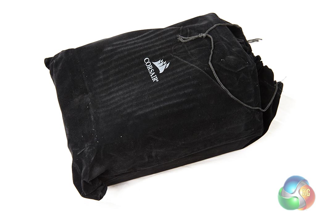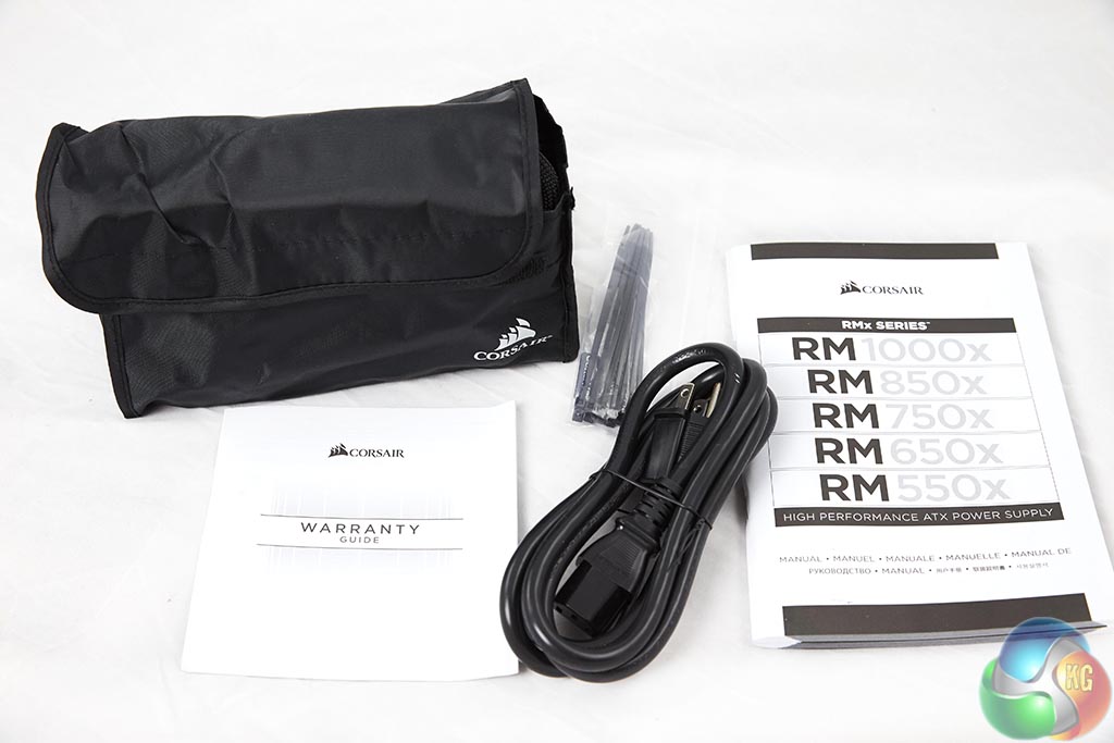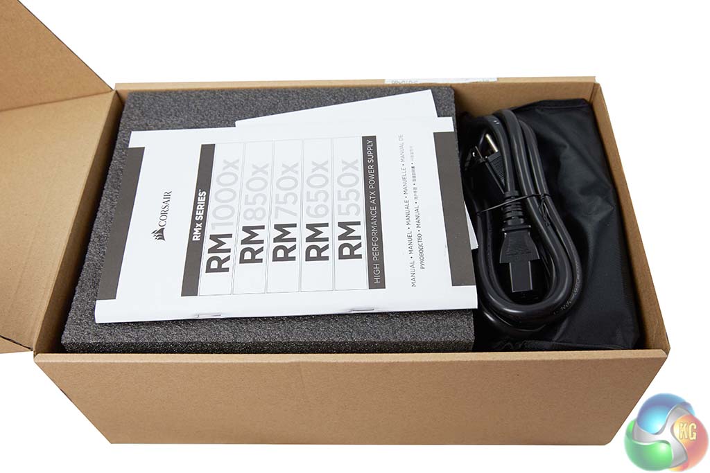 The power supply is protected inside thick foam with the cables at the side and the user manual on top. Corsair also include cable ties, case badge and a regional specific power cable.