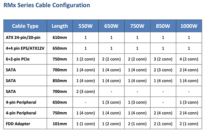 The RMx 750W has a total of four PCIe connectors across two cables – ideal for a dual card SLi or Crossfire configuration.