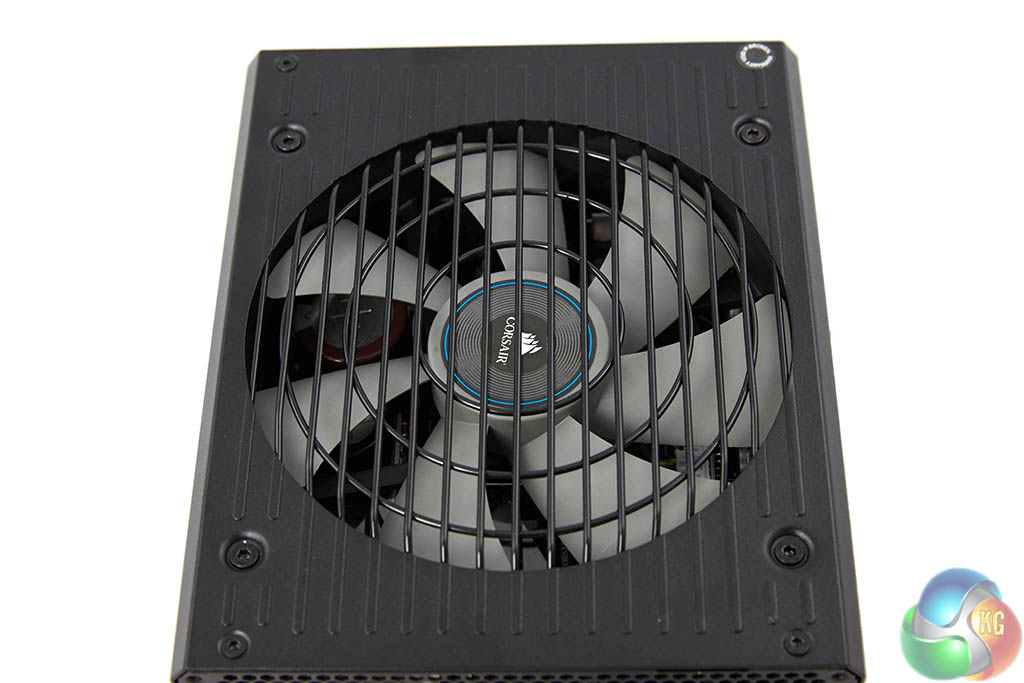 The modular bay is a three row implementation (750 watt model is two rows) – clearly labelled to make the build phase as straightforward as possible. The digital link connector is located in a separate panel at the side. As the sticker explained – the fan in this unit is often not spinning at all under general load conditions – Corsair have therefore thoughtfully included a ‘fan test’ button so the user can check the fan is actually working.