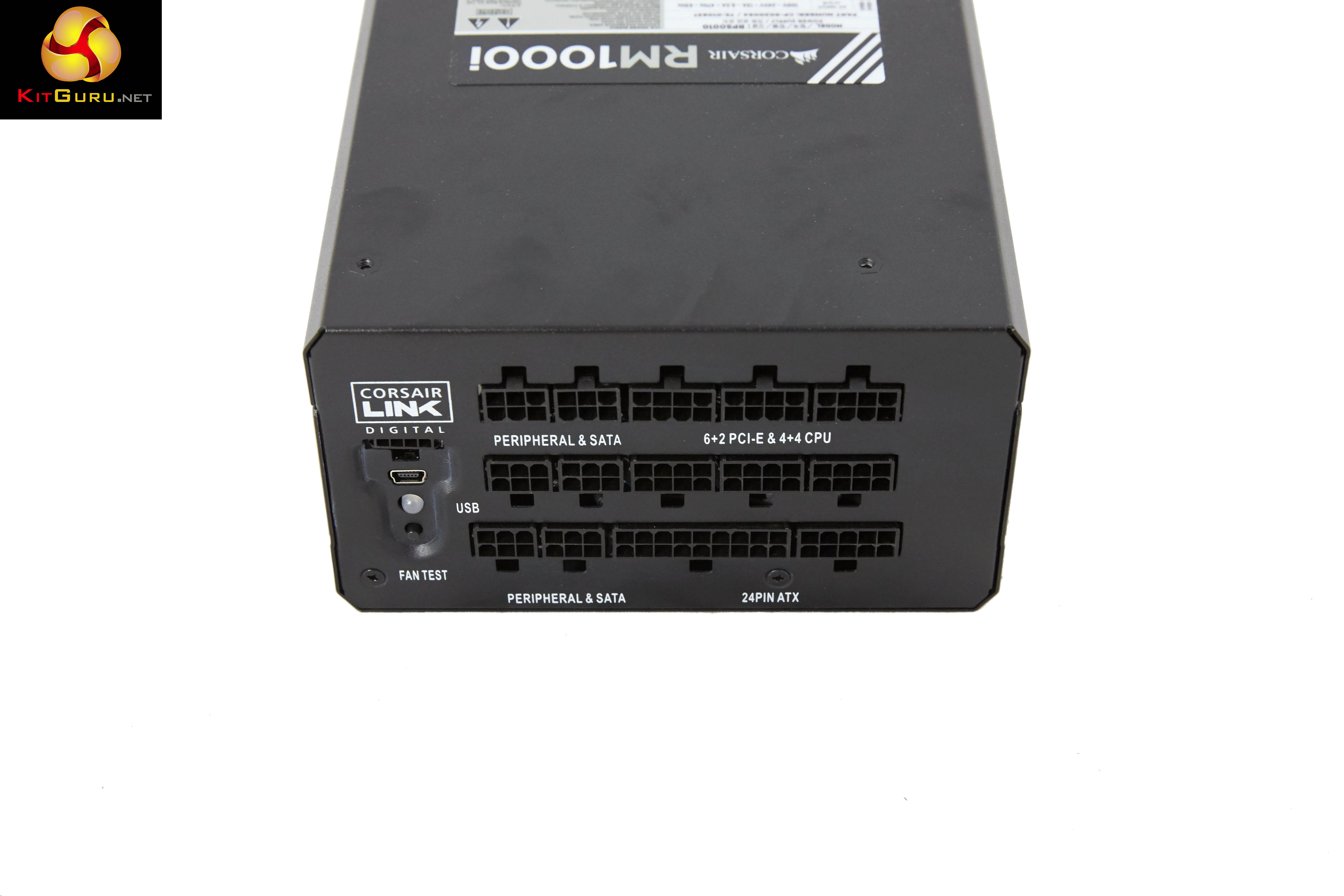 The modular bay is a three row implementation (750 watt model is two rows) – clearly labelled to make the build phase as straightforward as possible. The digital link connector is located in a separate panel at the side. As the sticker explained – the fan in this unit is often not spinning at all under general load conditions – Corsair have therefore thoughtfully included a ‘fan test’ button so the user can check the fan is actually working.
