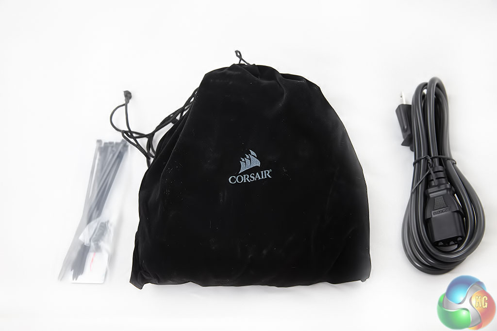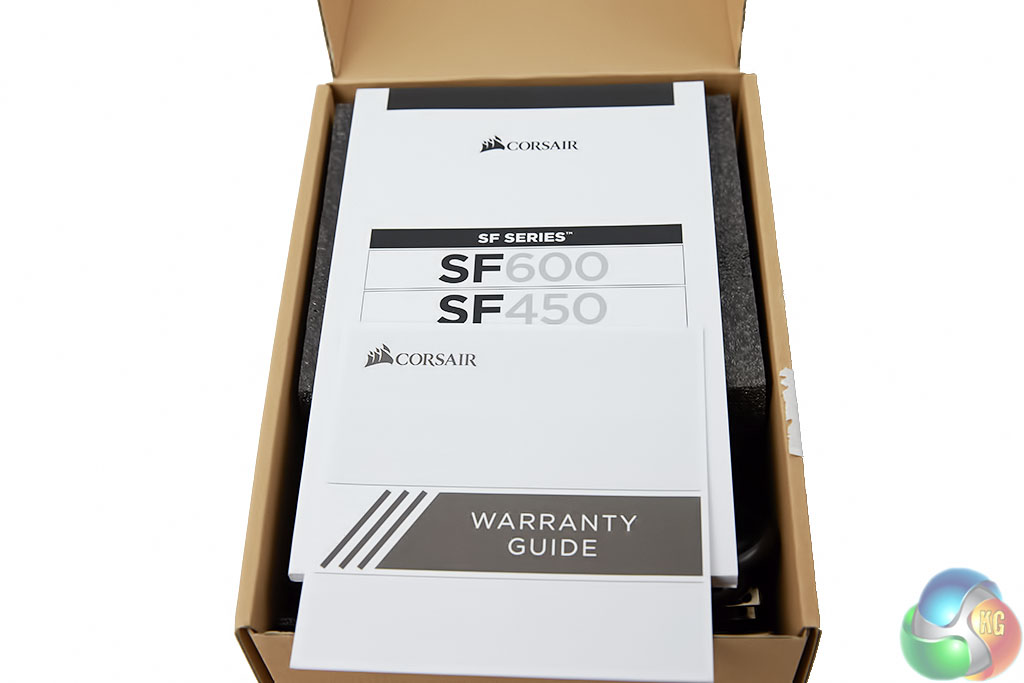 The power supply is encased in thick foam for added protection during shipping. On top is warranty information and a user manual. Alongside is a felt pouch containing the modular cables, cable ties, and a regional specific power cable.
