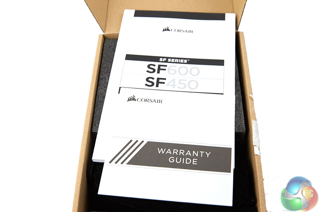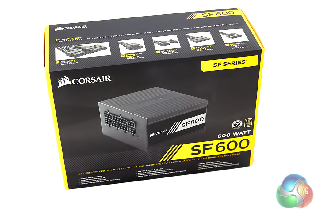 The Corsair box artwork is attractive – there is a high resolution image of the SF600 on the front of the box, and details for the power supply are shown on all sides.