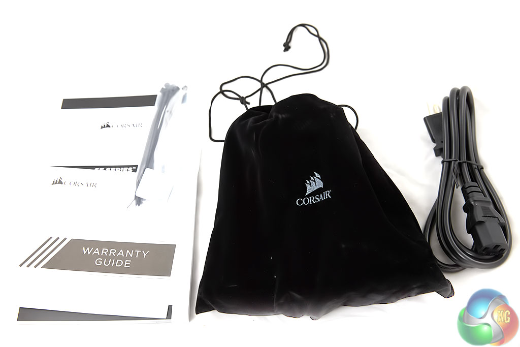 The power supply is encased in thick foam for added protection during shipping. On top is warranty information and a user manual. Alongside is a felt pouch containing the modular cables, cable ties, and a regional specific power cable.