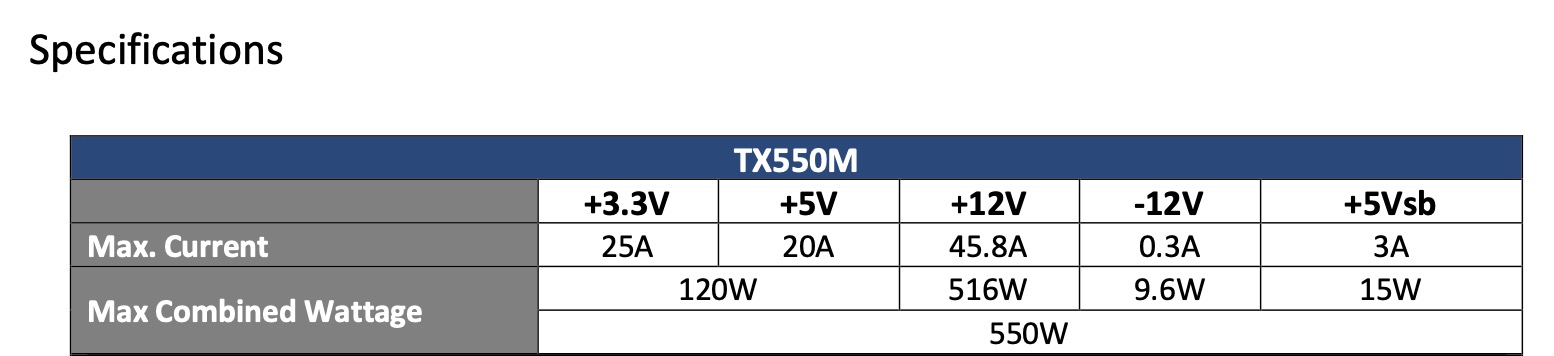 The TX550M delivers close to 46A on the +12V rail which is adequate for a graphics card that would be installed in a system adopting a power supply of this capacity.