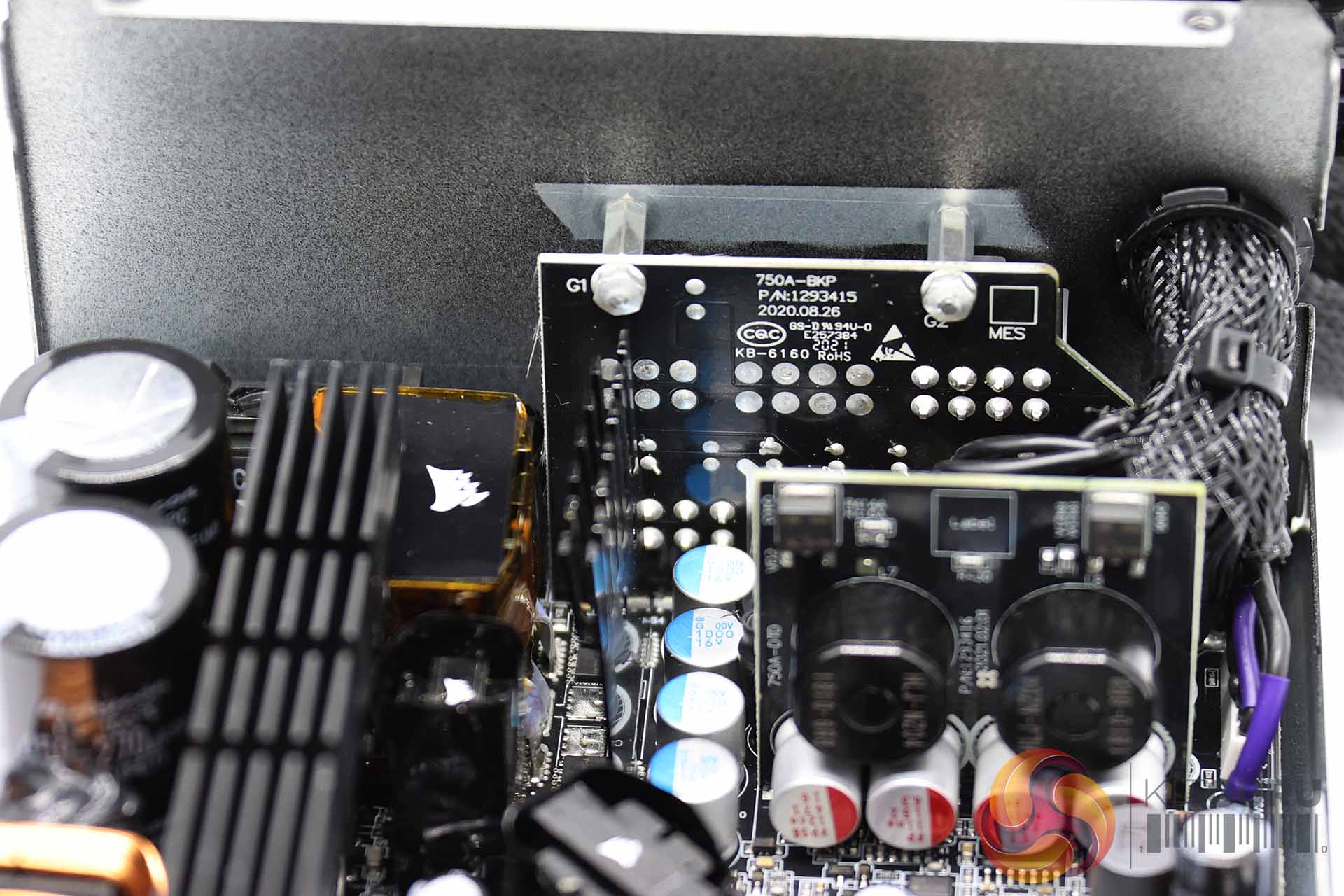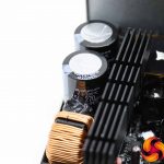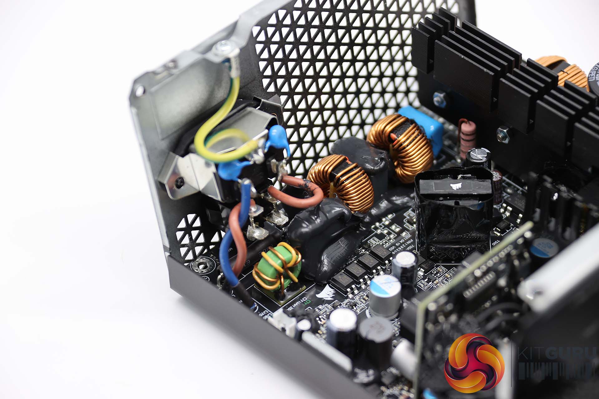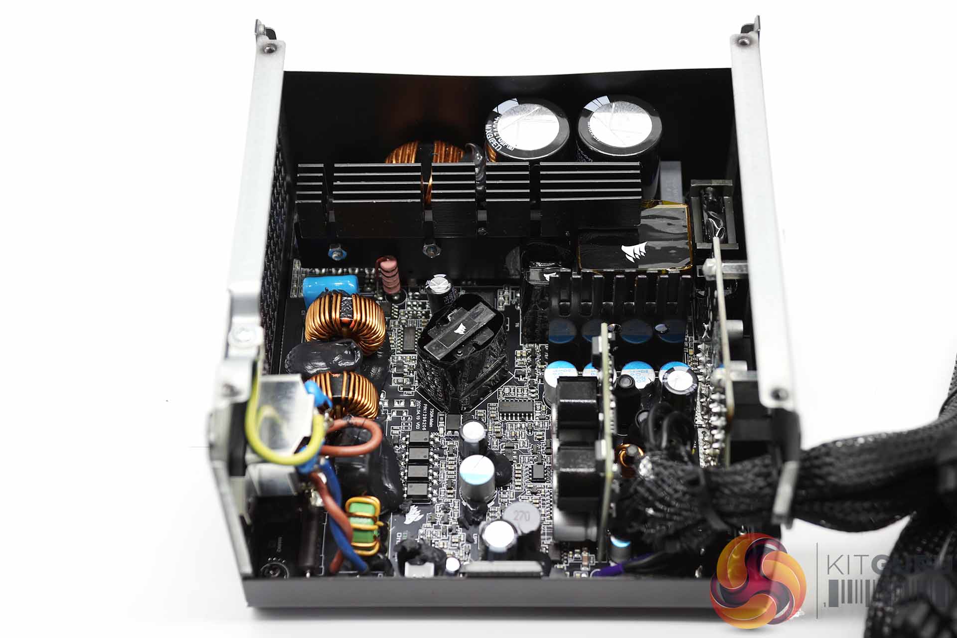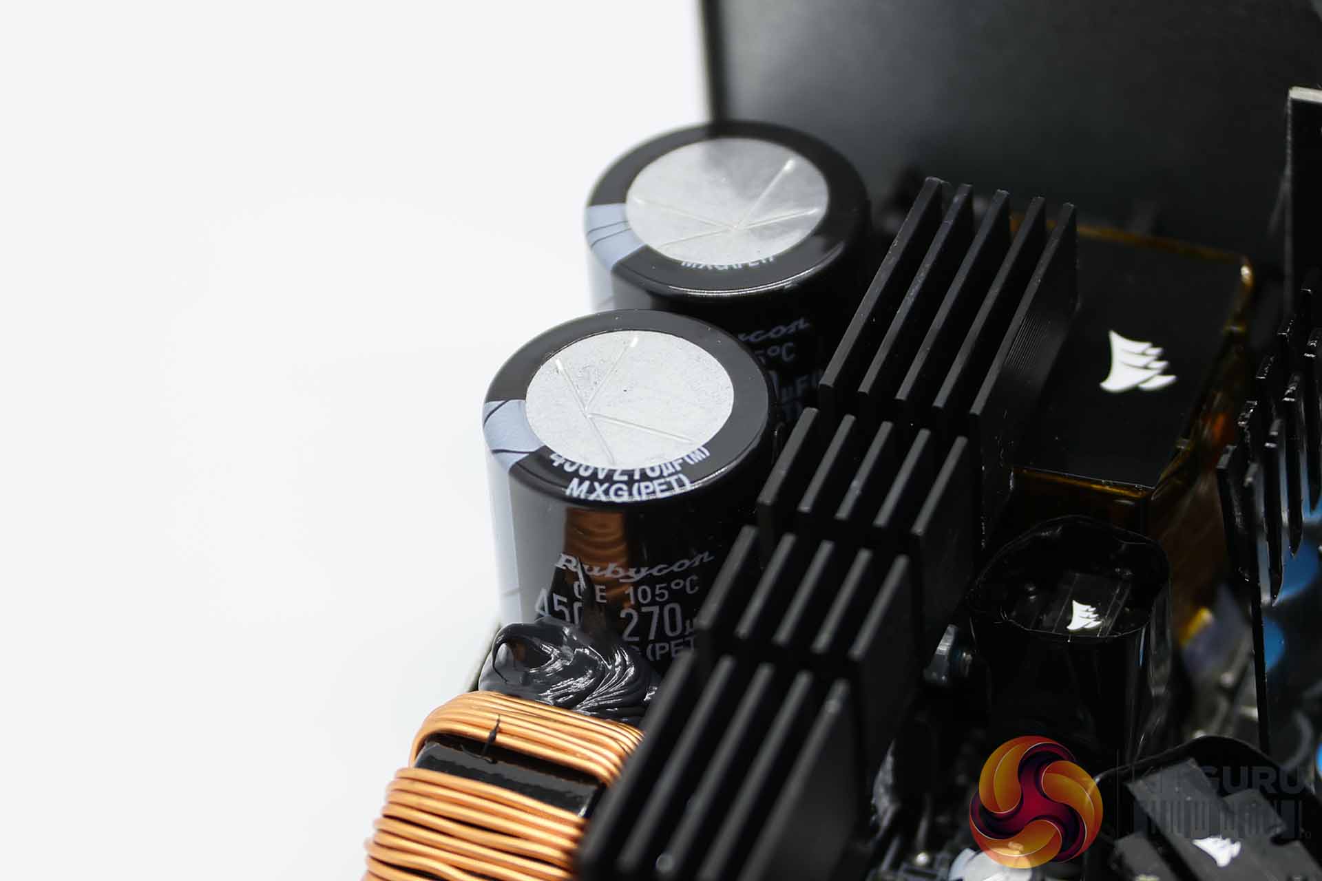 Corsair have partnered up with Great Wall for this unit. It adopts a Resonant LLC topology with DC to DC conversion. It is very impressive to see Corsair using high grade Japanese 105C Rubycon capacitors in the primary stage – two rated 450V 270uF for a total of 520uF output capacity. There are several rows of heatsinks inside the unit to aid with cooling from the fan above. Soldering on the PCB is decent across the board.
