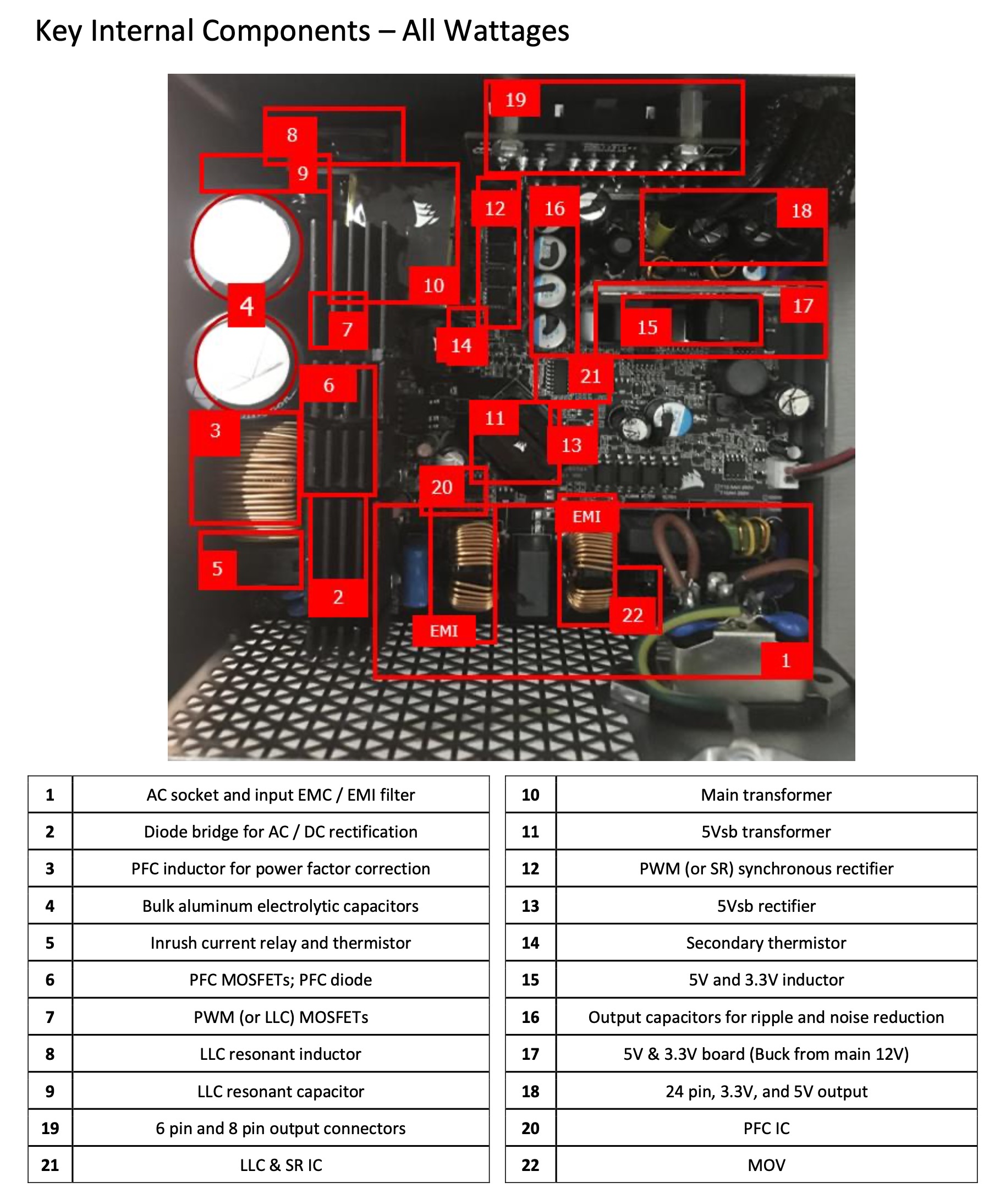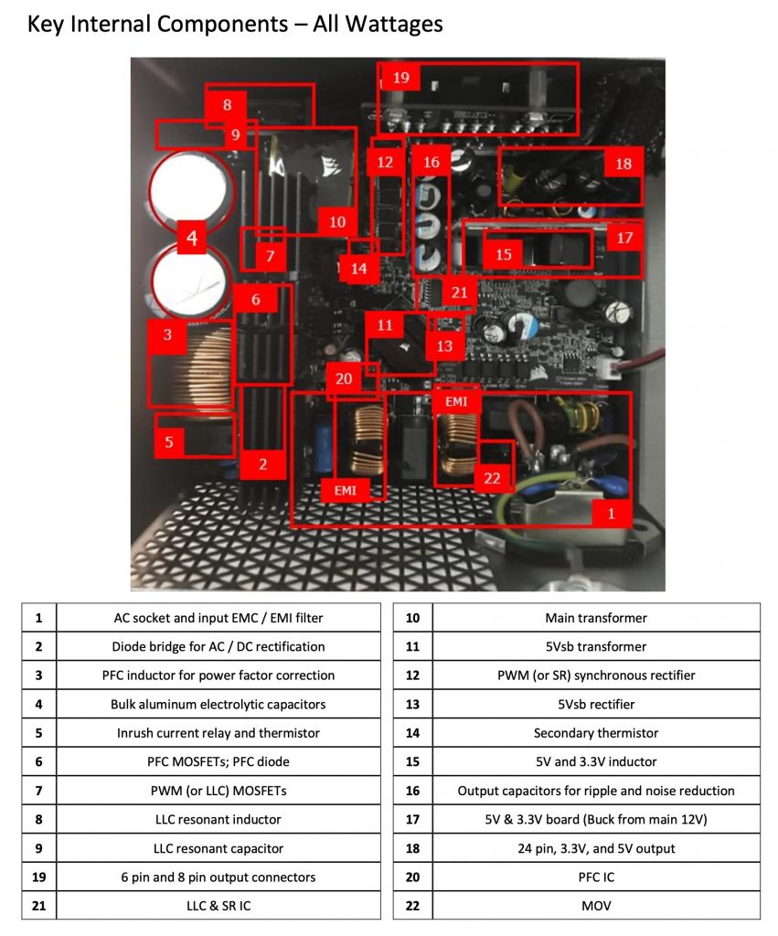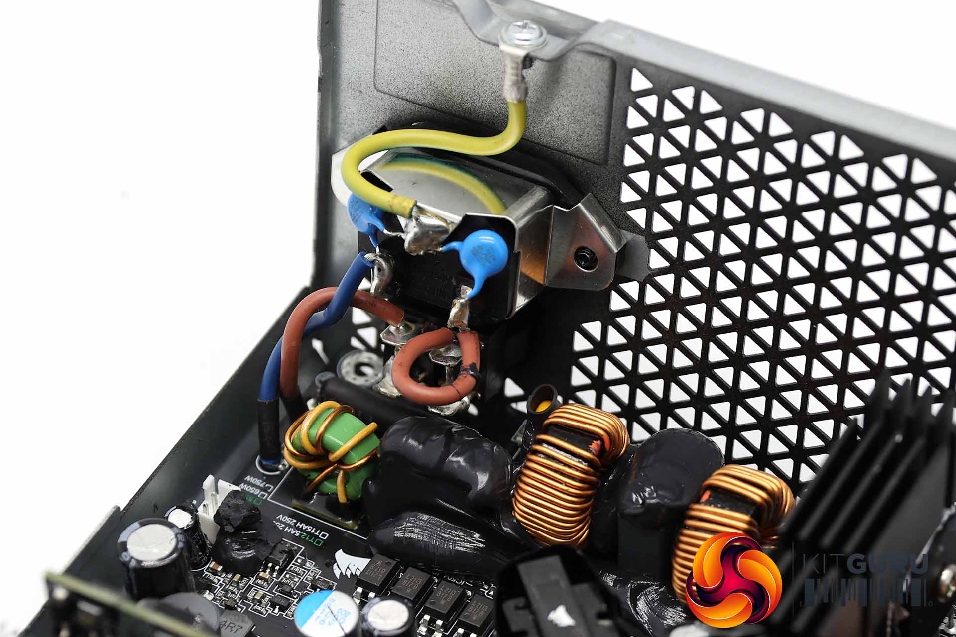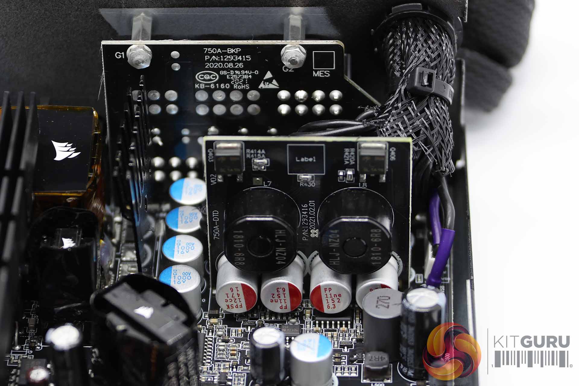 Corsair have partnered up with Great Wall for this unit. It adopts a Resonant LLC topology with DC to DC conversion. It is very impressive to see Corsair using high grade Japanese 105C Rubycon capacitors in the primary stage – two rated 450V 270uF for a total of 520uF output capacity. There are several rows of heatsinks inside the unit to aid with cooling from the fan above. Soldering on the PCB is decent across the board.