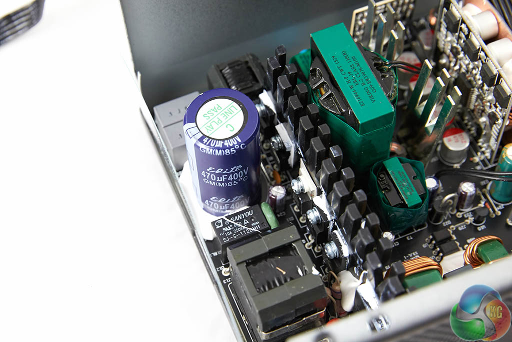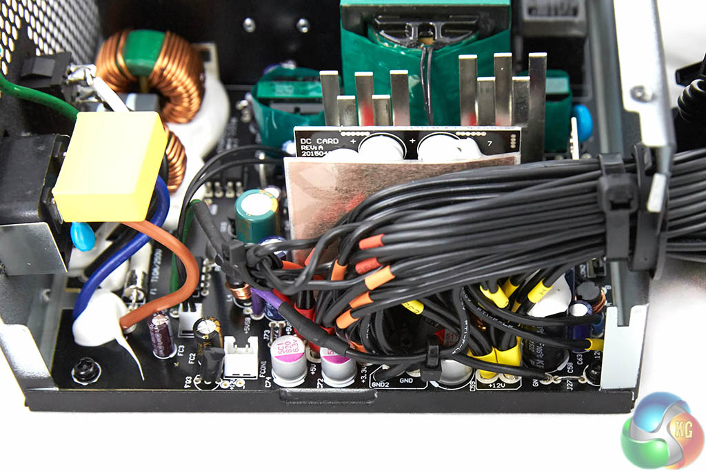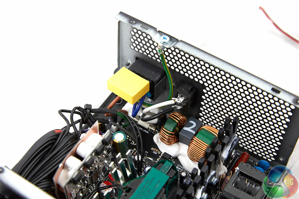 The filtering stage starts at the AC input receptacle and continues onto the main PCB. They are using a double EMI filter to try and stablise the voltages. The bridge rectifier has its own heatsink with another heatsink close by on the PFC power components and primary switching transistors. Wiring on the board varies, but some areas could certainly be better.