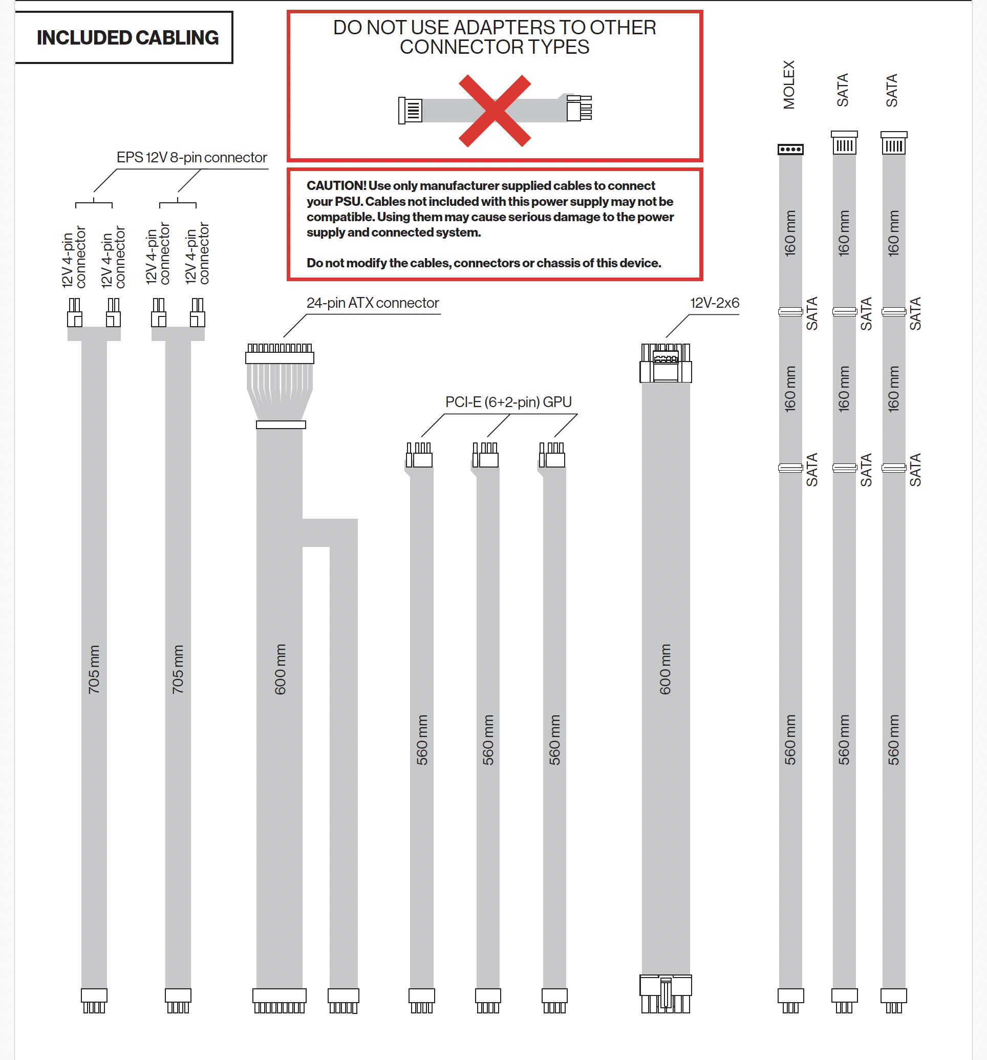 Endorfy include a range of ribbon/flat style cables which prove easier to route in a modern system. None of the cables have in cable capacitors and they are reasonably high quality throughout. The ATX connector is 18-20AWG and the 4+4 pin EPS12V measures 710mm and is 18AWG. The PCIe cables are 560mm long and 18 AWG. SATA cables are also 18AWG and measure 560 mm with 155mm lengths between. The 12+4 Pin PCIe cable is 605mm and is rated to 600 watts. It is 16-22 AWG Gauge.
