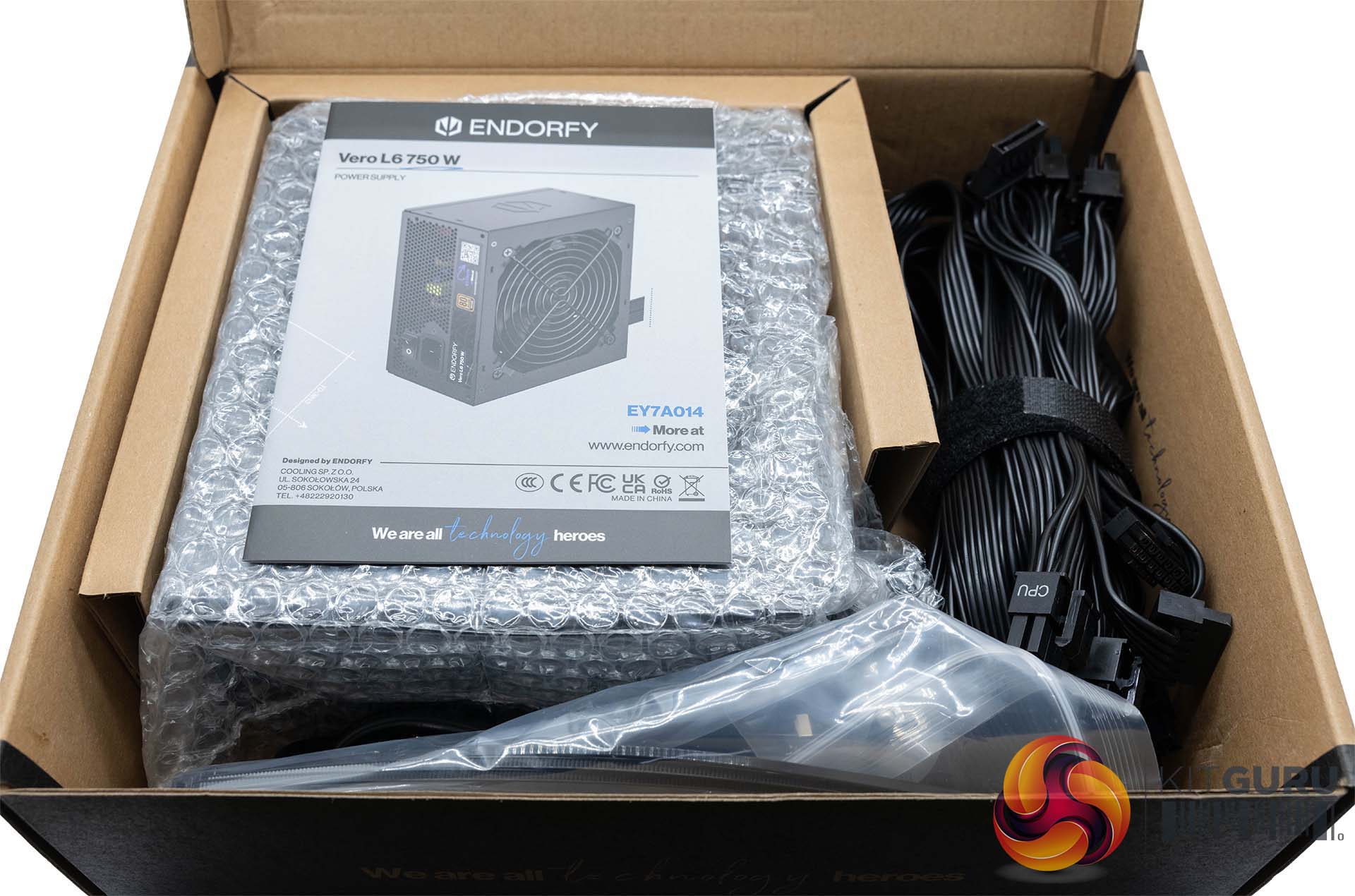 Inside the box is the PSU between two thin pieces of cardboard and a protective wrap. A user manual is placed above.