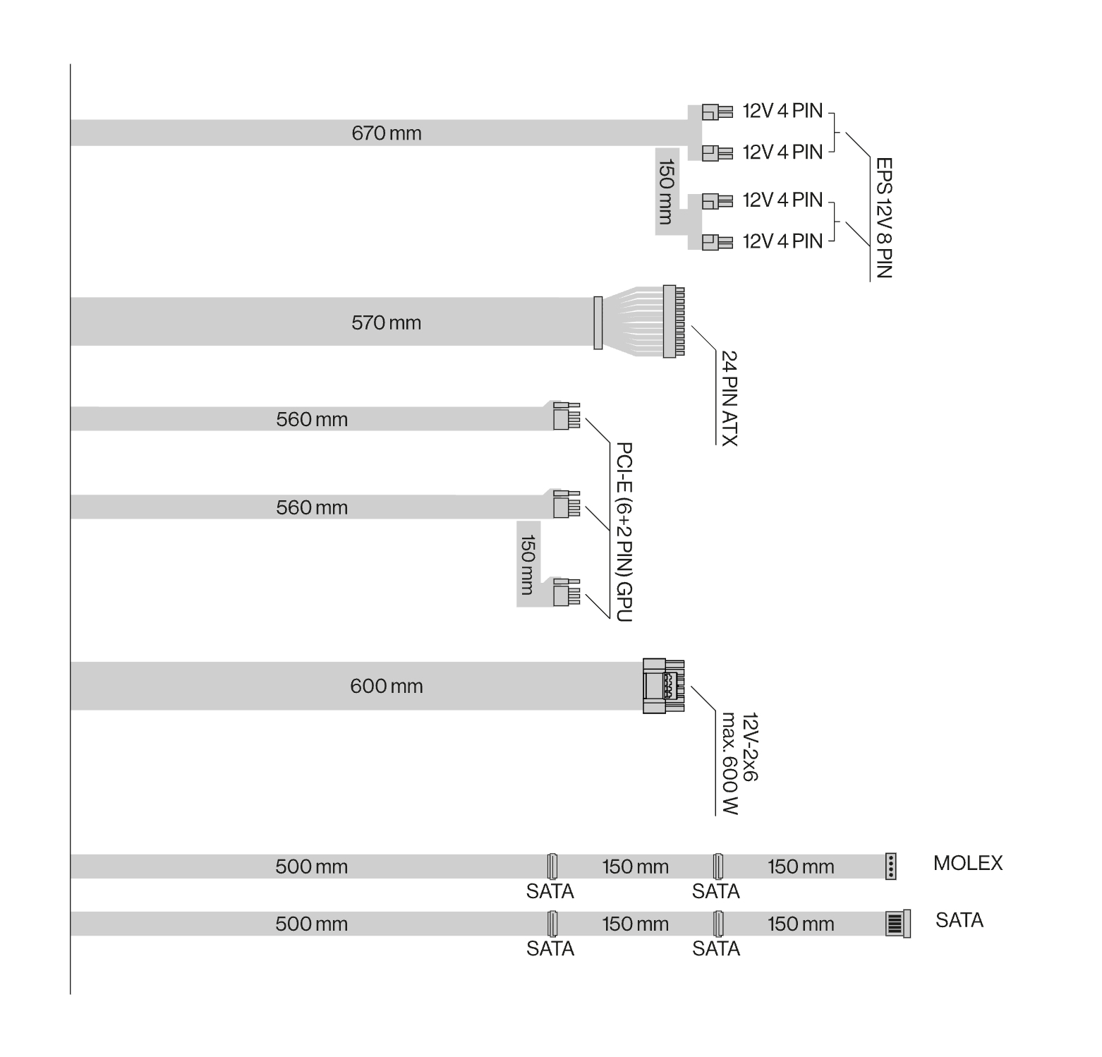 The cabling length and quality is fine considering the budget sector this unit is targeting, this PSU is designed for lower cost to low-mid priced systems. There are some copper in-cable capacitors.