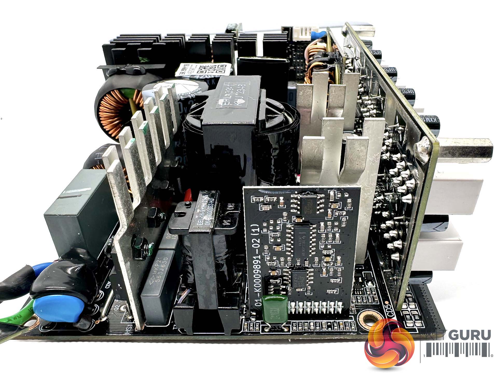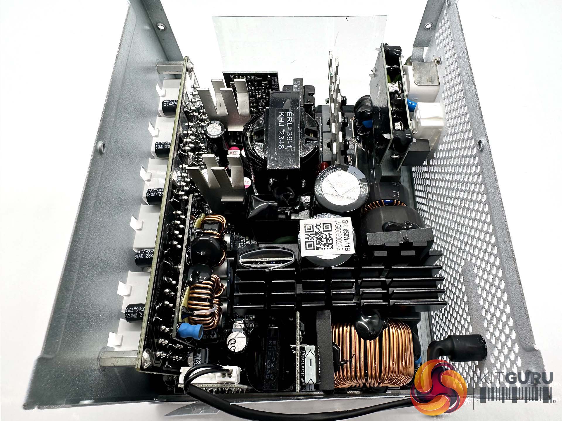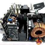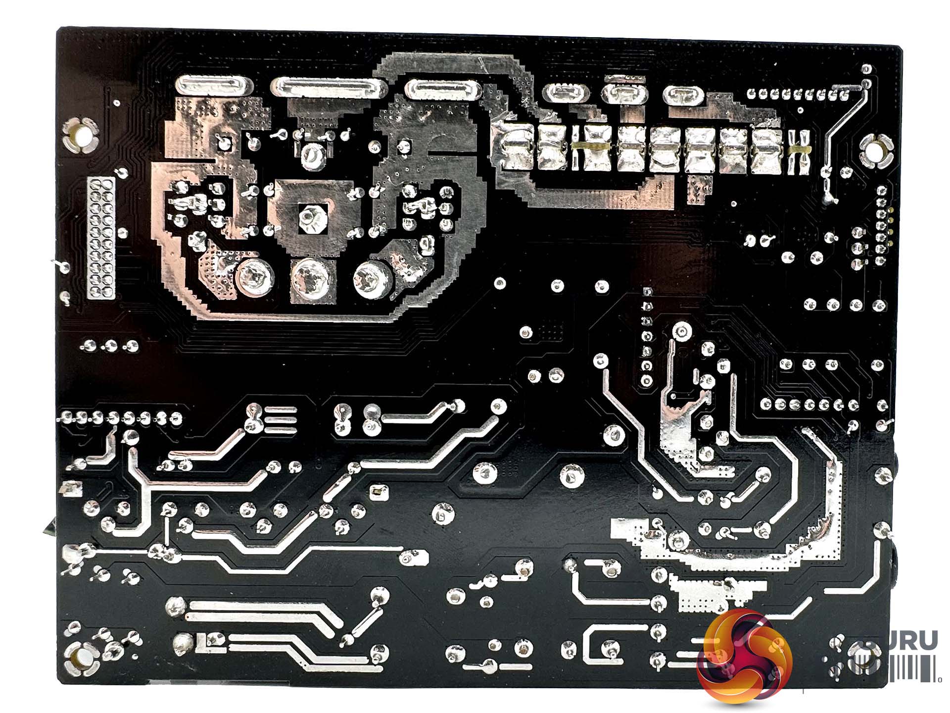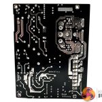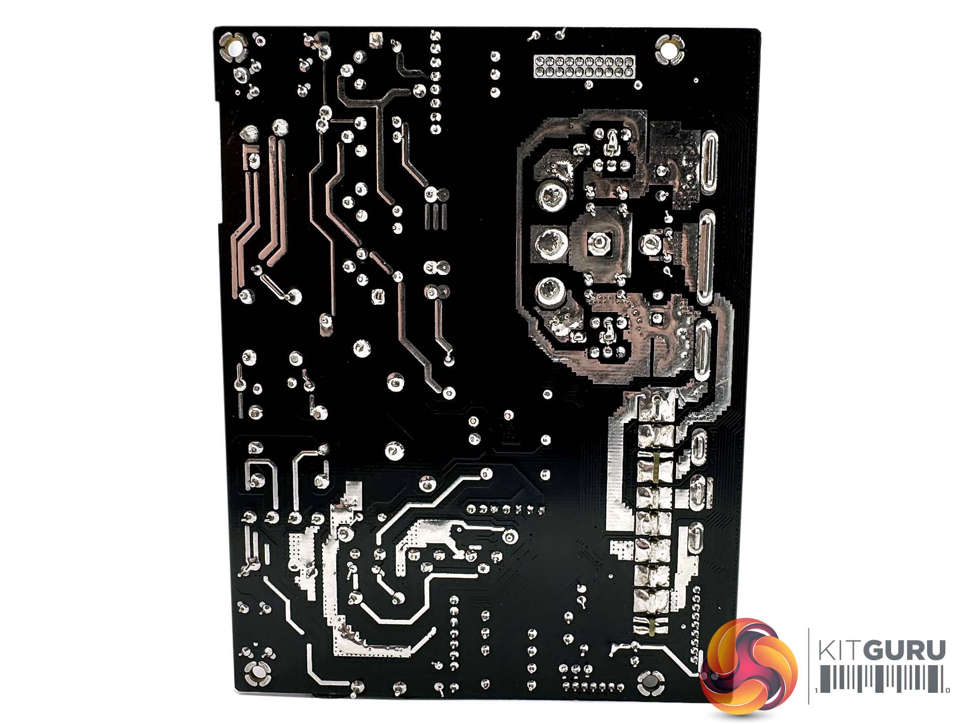 The design incorporates a PFC converter with a full bridge topology with a LLC resonant converter. Minor rails are generated via four FETS which regulate the 12V rail, feeding into DC-DC converters. Soldering on the board is very good, with an overall clean design throughout.