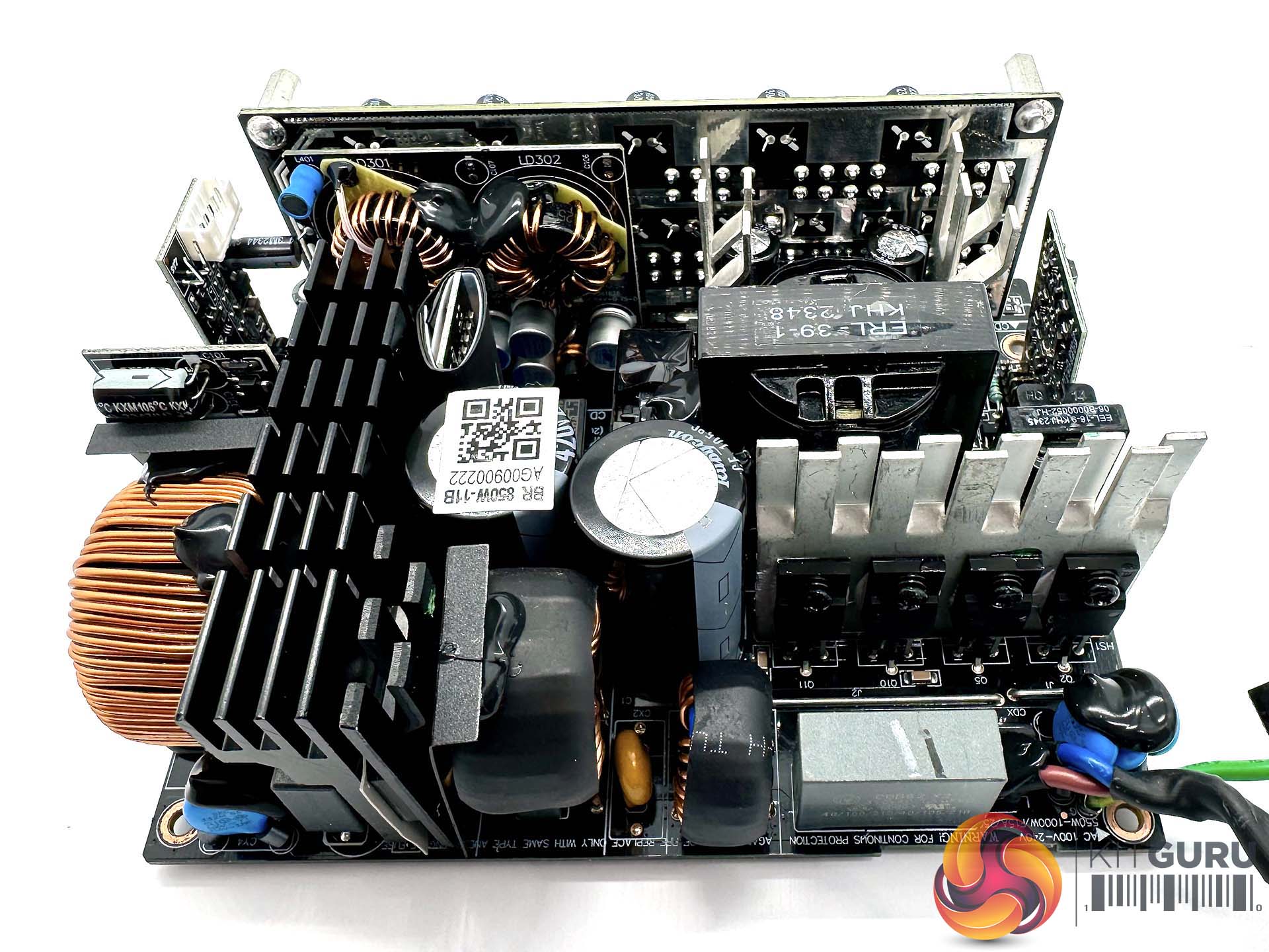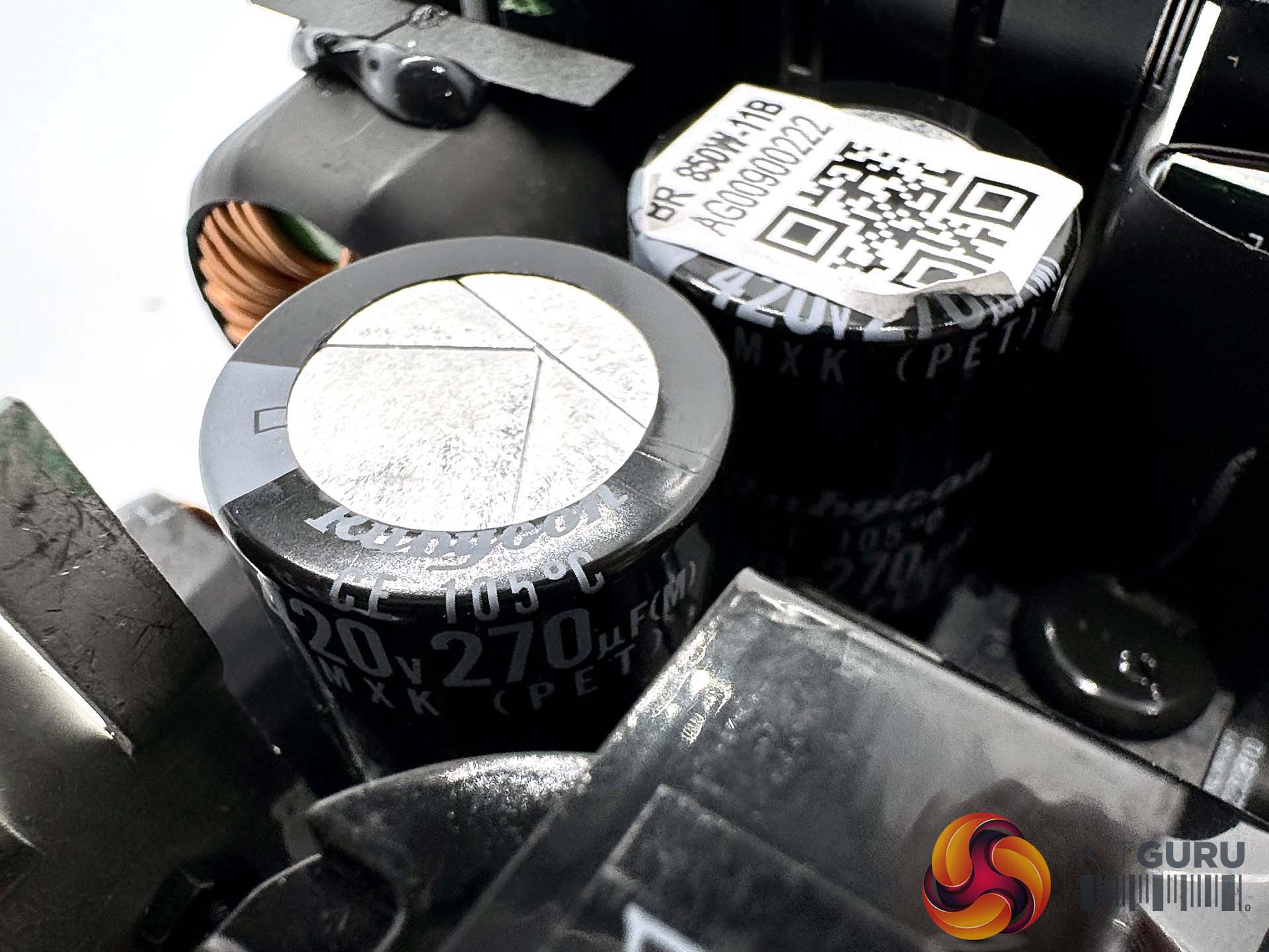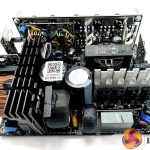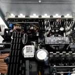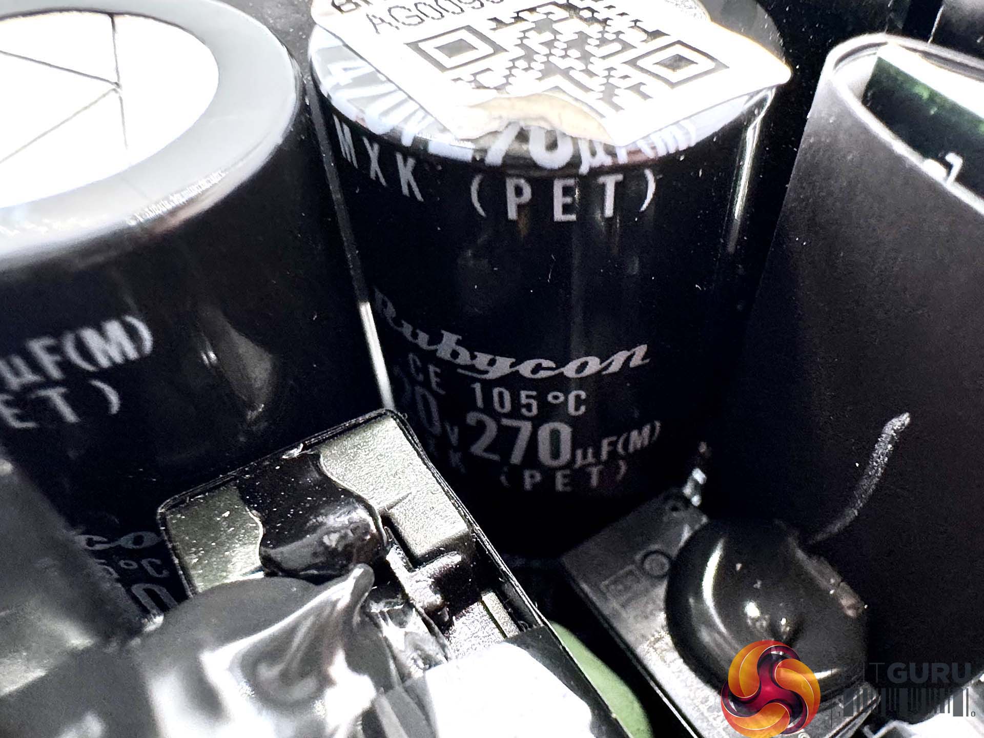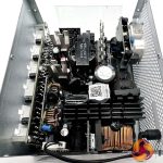 The PCB in this power supply is tiny, so therefore it's densely populated with components. OEM partner RSY have adopted various daughter-cards to compensate for the tiny physical width of the main board. Two Japanese 105C rated capacitors by Rubycon make up the primary stage – rated 270uF 420V, for a total of 540uF.