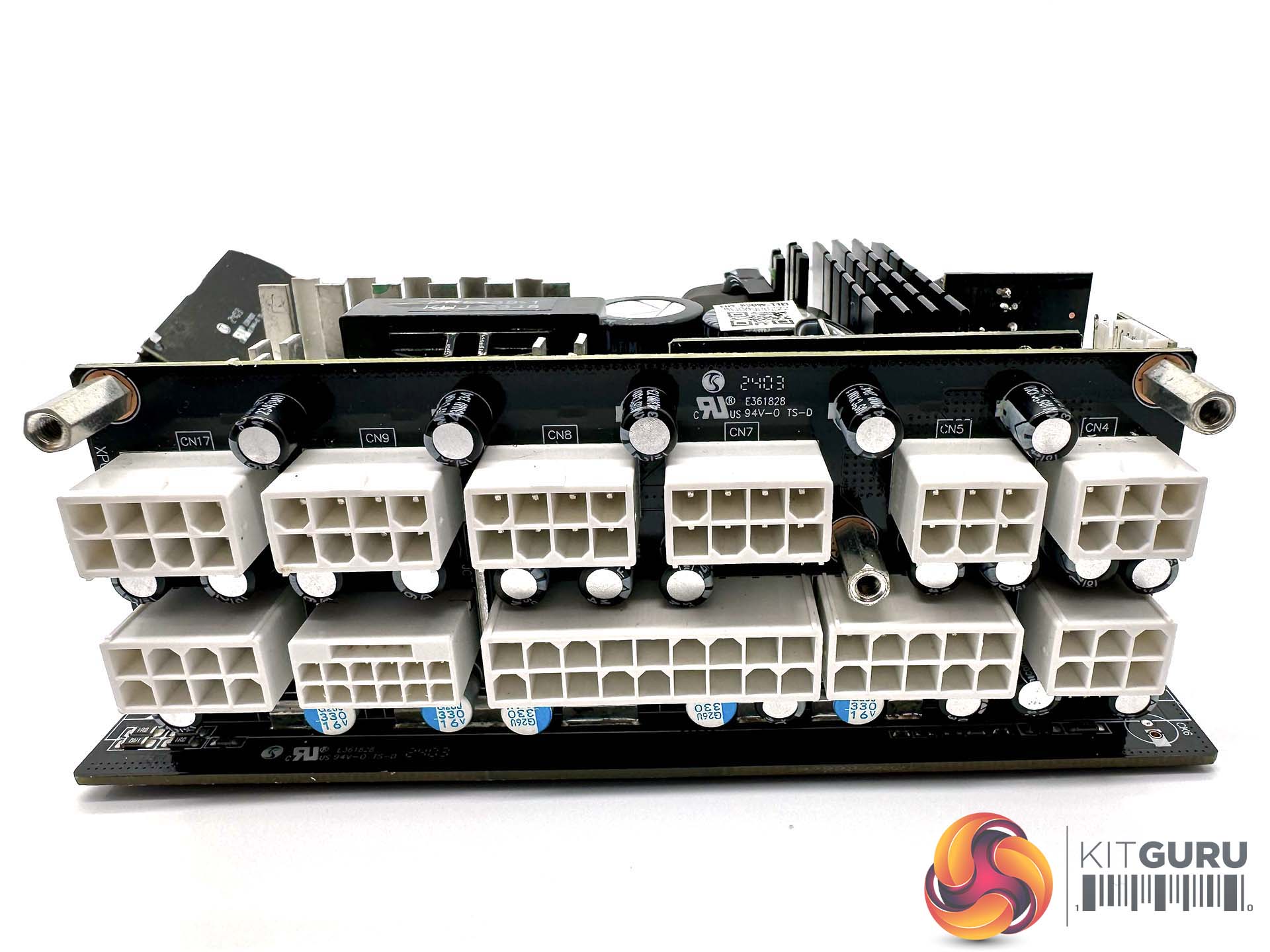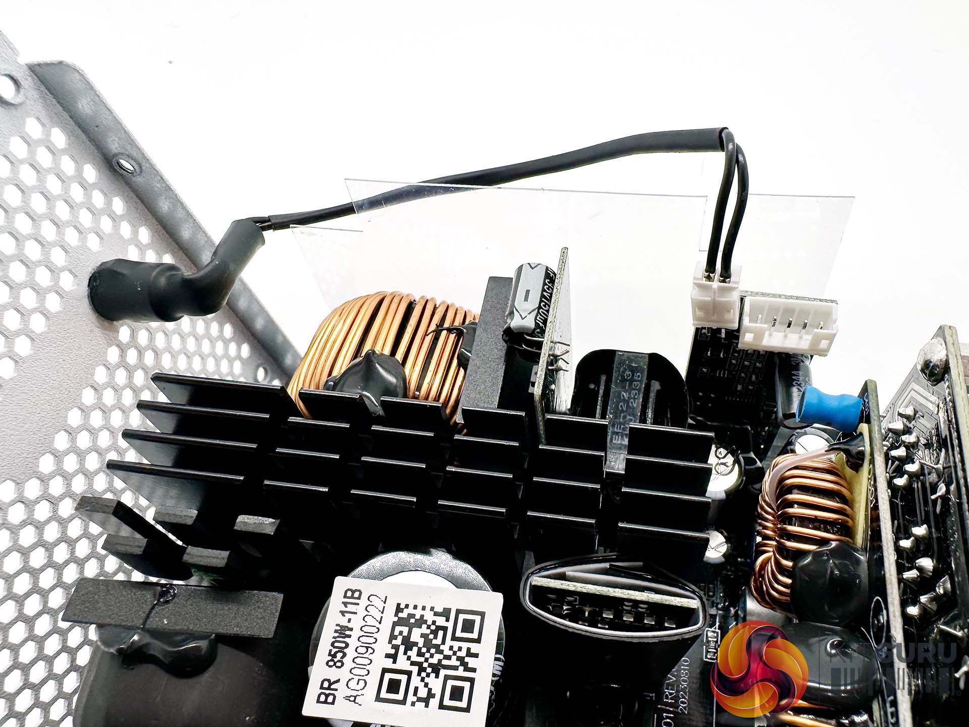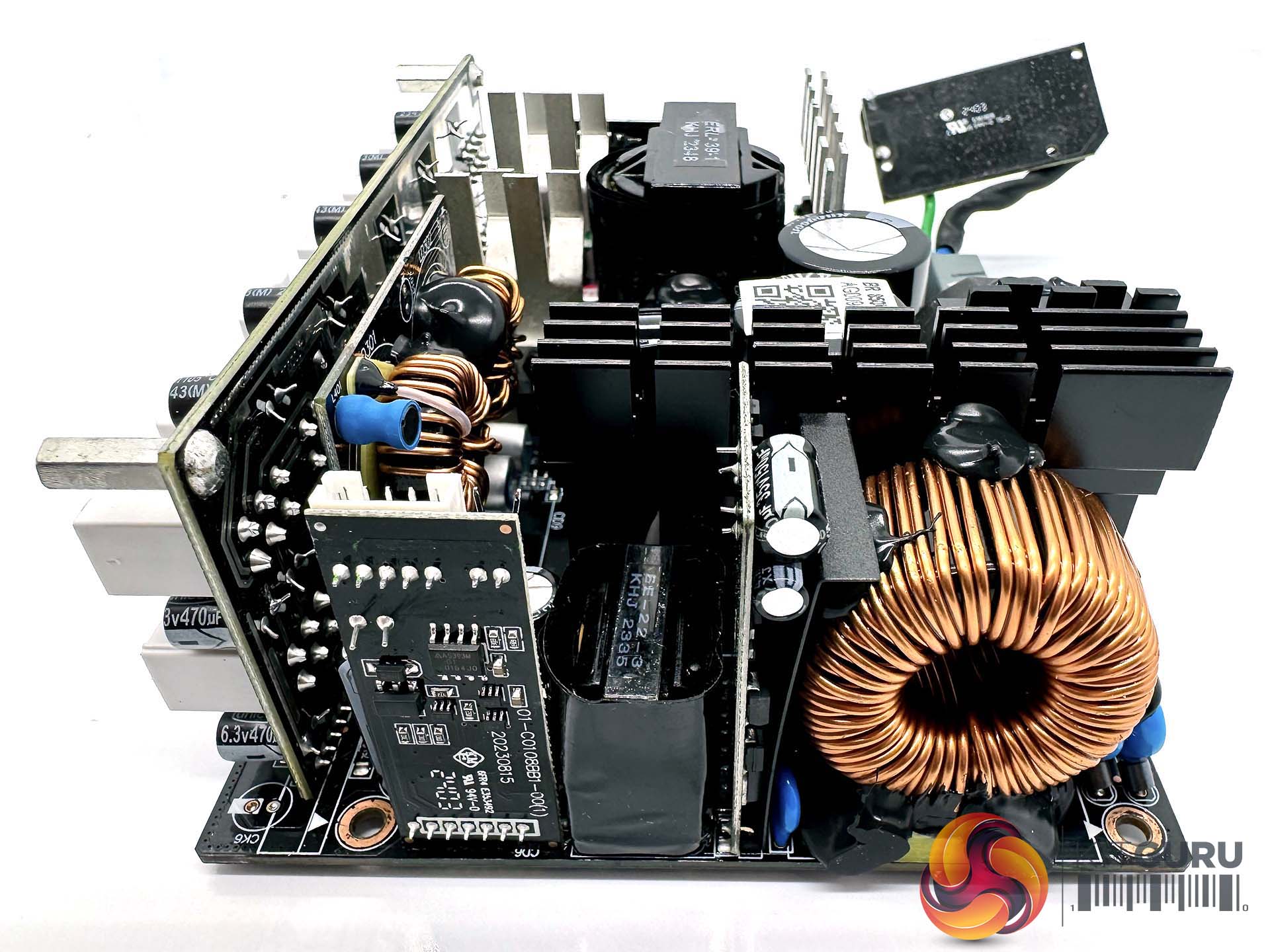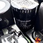 The PCB in this power supply is tiny, so therefore it's densely populated with components. OEM partner RSY have adopted various daughter-cards to compensate for the tiny physical width of the main board. Two Japanese 105C rated capacitors by Rubycon make up the primary stage – rated 270uF 420V, for a total of 540uF.