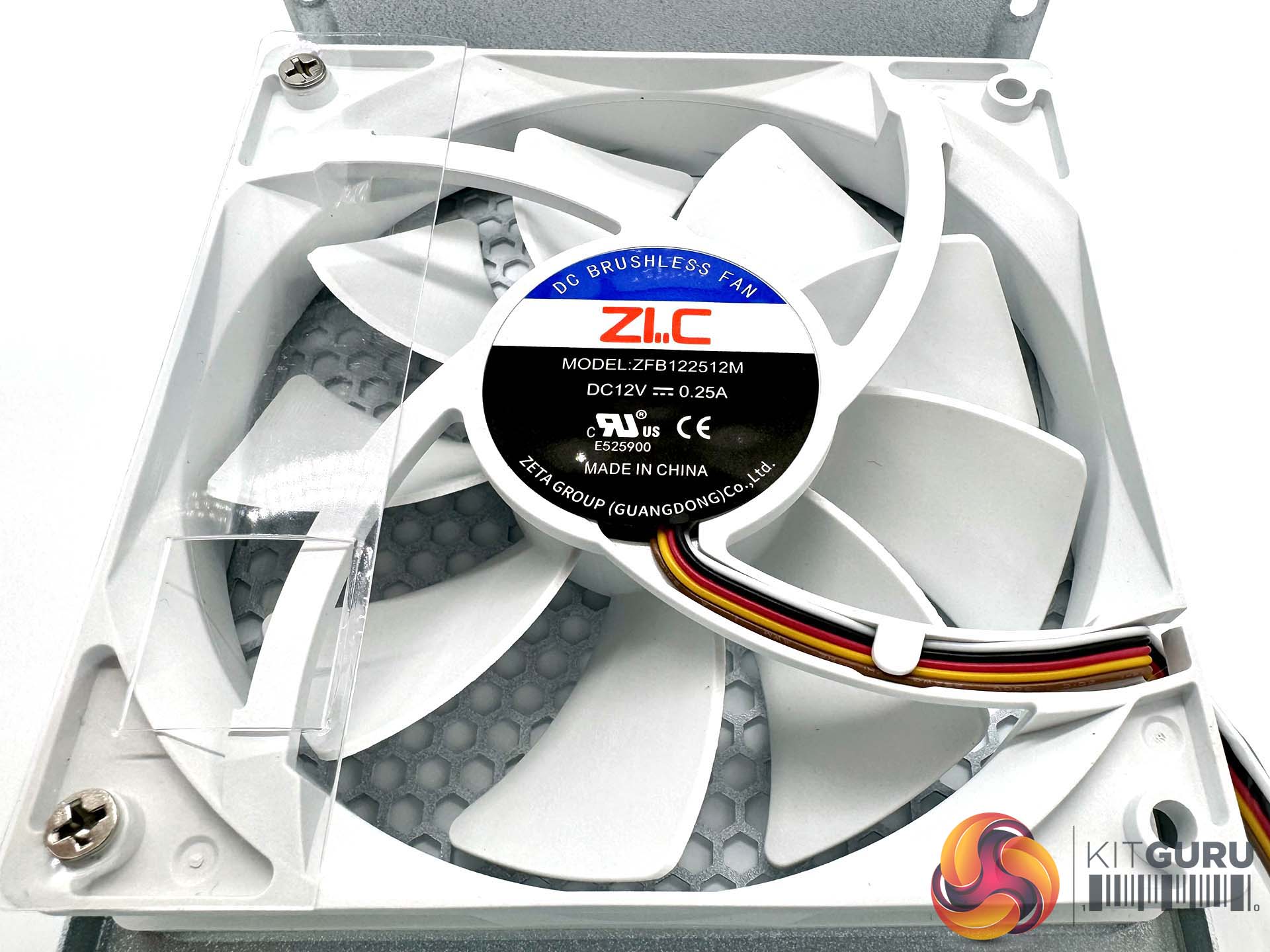 The fan inside is a ZIC ZFB122512M by ZETA Group. As mentioned earlier in the review, this is a double ball bearing fan – they are generally less expensive than fluid dynamic fans and often slightly louder too. Still, I have used plenty of double ball bearing fans for many years as they have good lifespan. A small plastic shroud covers part of the fan, to direct air over specific components underneath.
