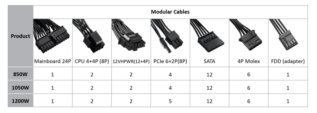 The cables are all sleeved for ease of routing during the build phase. The motherboard cable is 65cm long. The CPU 4+4 connectors are 60cm and 70cm respectively. The 12VHPWR 12+4 pin cable is 60cm long. The PCIe 6+2 pin cable is 2×65/15cm. The 2xPCIe 8 pin – 12VHPWR splitter cable is 60cm. The 12x SATA cables are 4×45/15/15/15cm. The 4P Molex cables are 2×50/15/15cm. The extra dual PCIe 8-pin to 12VHPWR cable may come in useful.