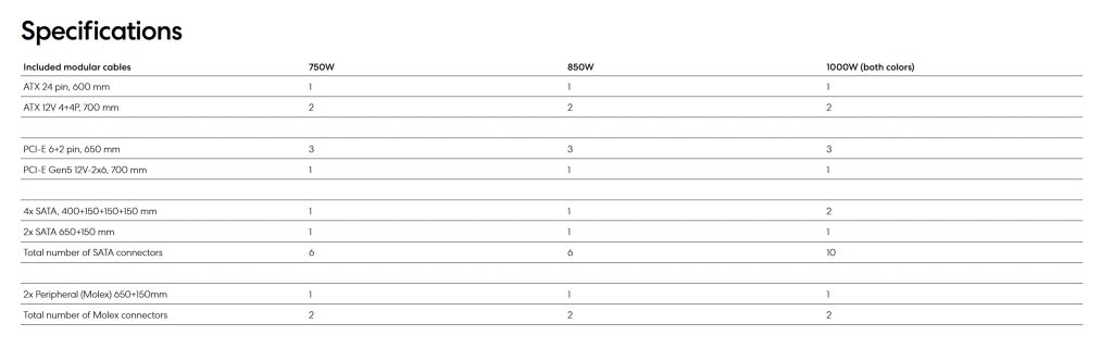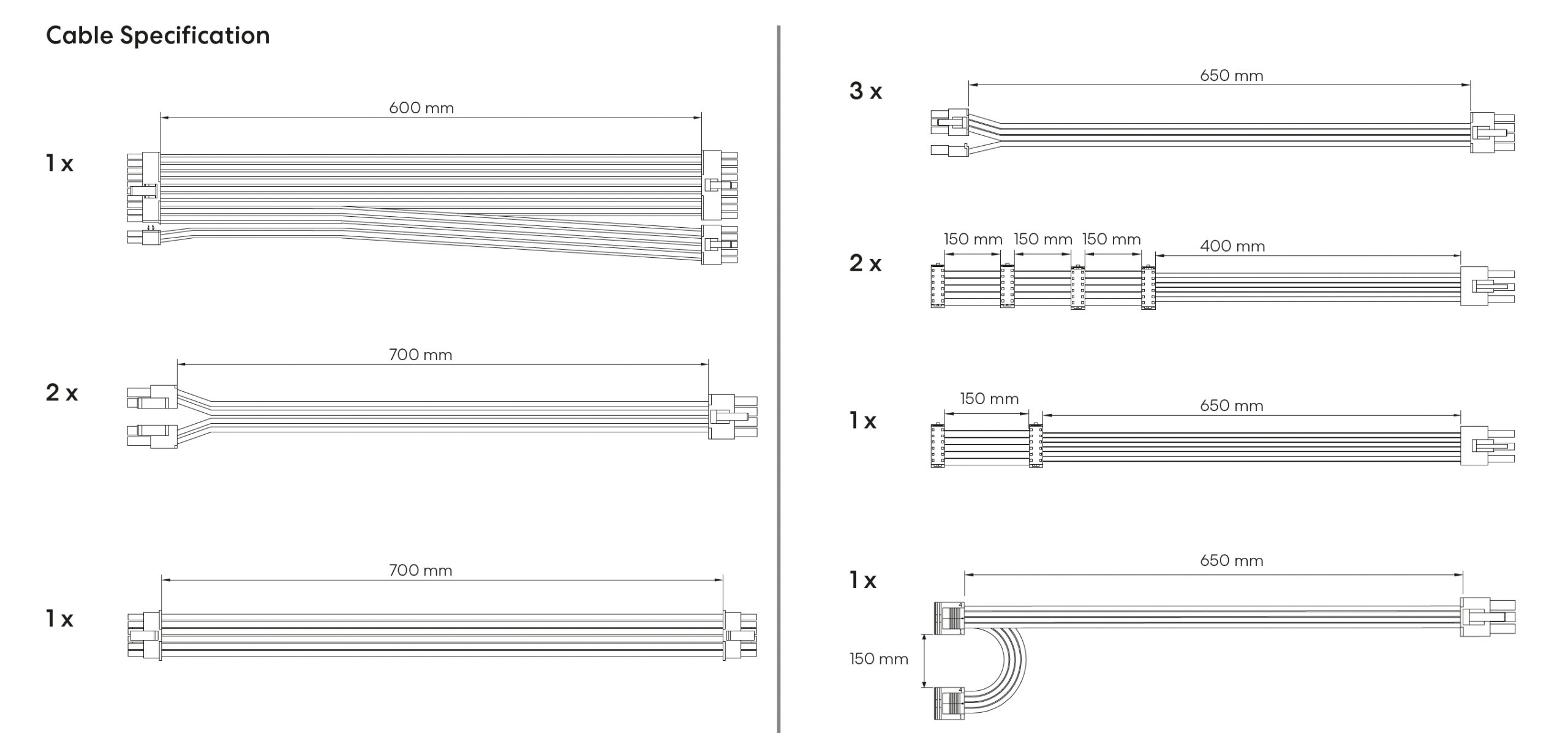 The 1000W version of the power supply ships with plenty of cables and connectors to suit a variety of system build demands, including a 12V-2×6 and a total of 10 SATA connectors. There are no in-cable capacitors.