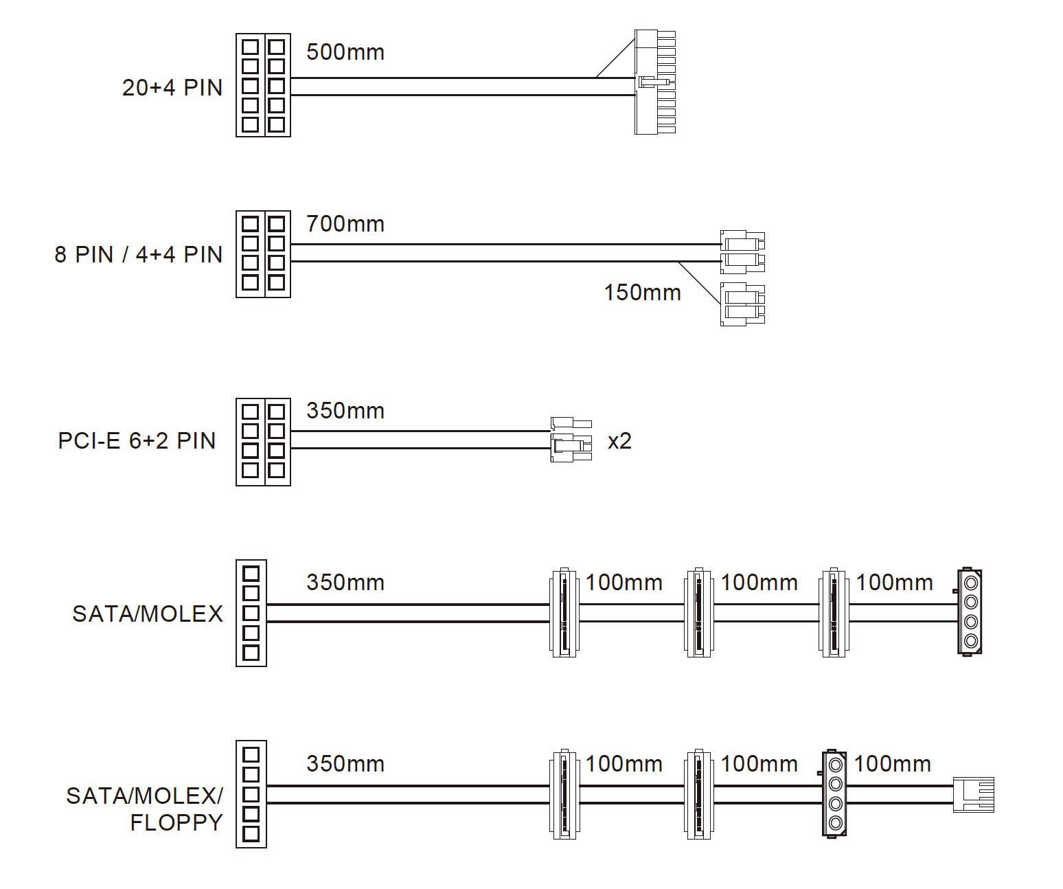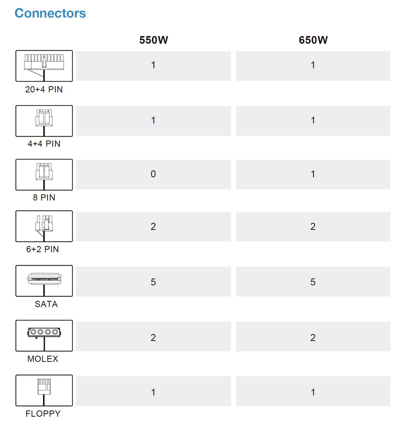 We can see the cabling between 550W and 650W units is the same, however the higher 650W model also includes an 8 PIN CPU power connector, to go along with the 4+4 pin cable. Both units have two 6+2 pin PCIe cables to support a high end graphics card.