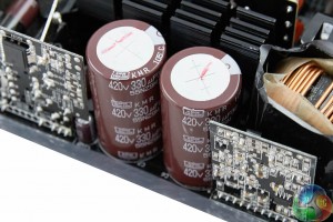 FSP are using a pair of high grade 105c rated Japanese capacitors on the primary stage – both rated 420 V 330uF. These are from the KMR range. On the main PCB we found standard electrolytics from Rubycon and Nippon Chemi Con. I was a little disappointed to see a few solid capacitors on the main PCB from Chinese company TEAPO.