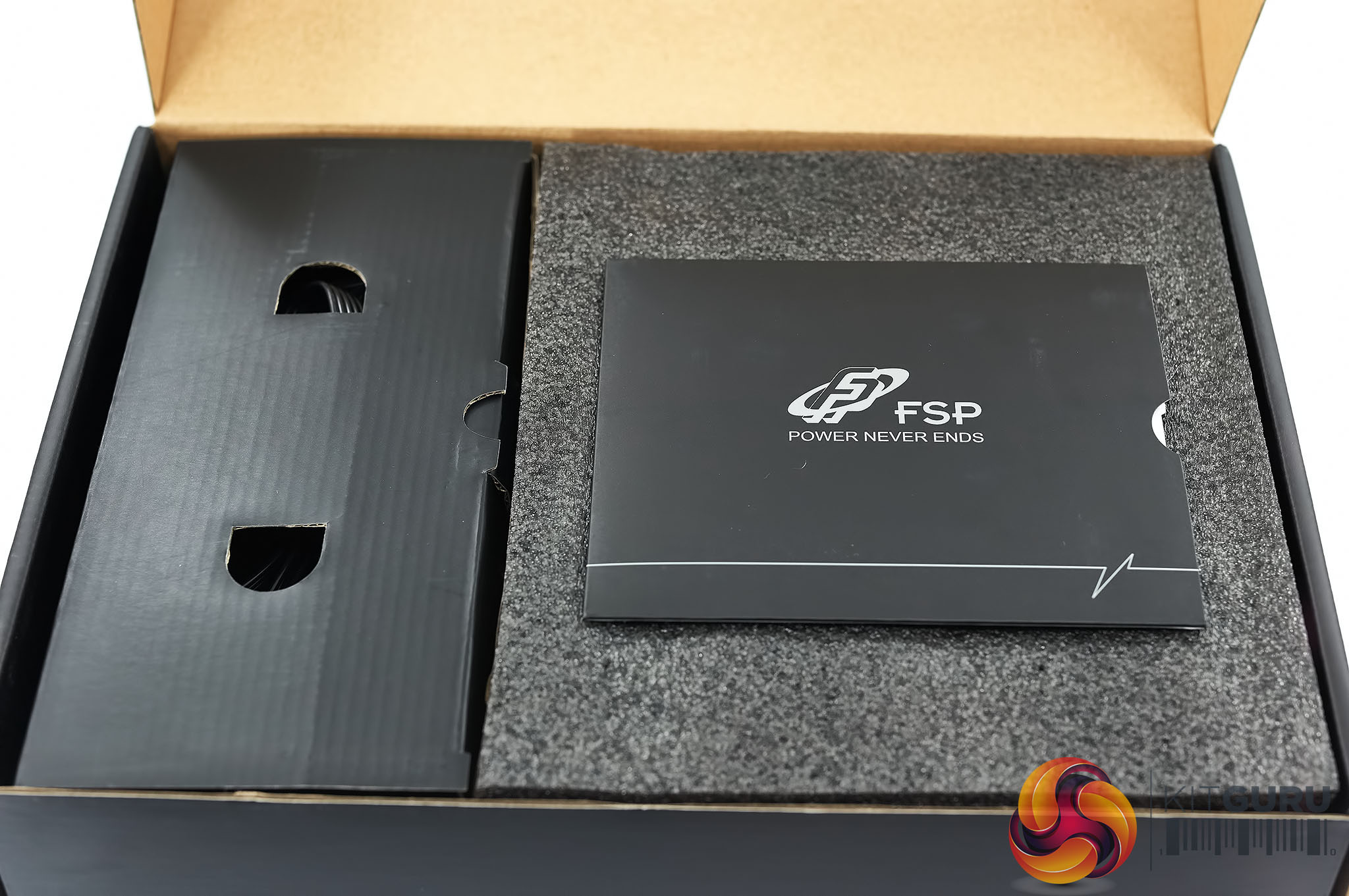The packaging inside shows that the power supply itself is protected inside thick pieces of foam. At the side is a container for the accessories and a little user manual is placed on top.