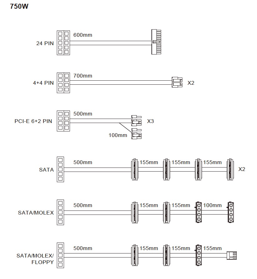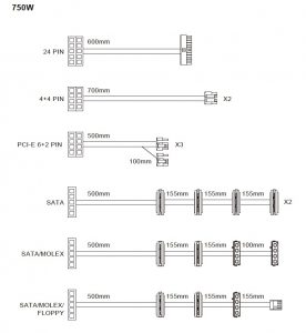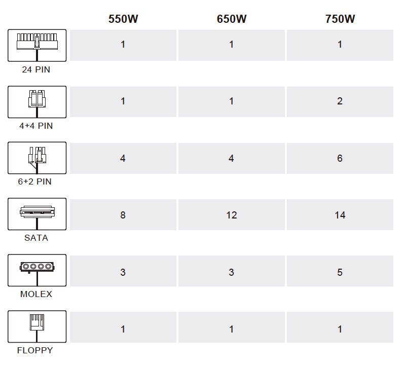 The 750W is the only unit in this specific range to offer dual 4+4 pin EPS power connectors to deliver plenty of power for the most demanding processors (AMD Threadripper for instance). There are also 14 SATA power connectors for those people who have a lot of Solid State and mechanical hard drives.