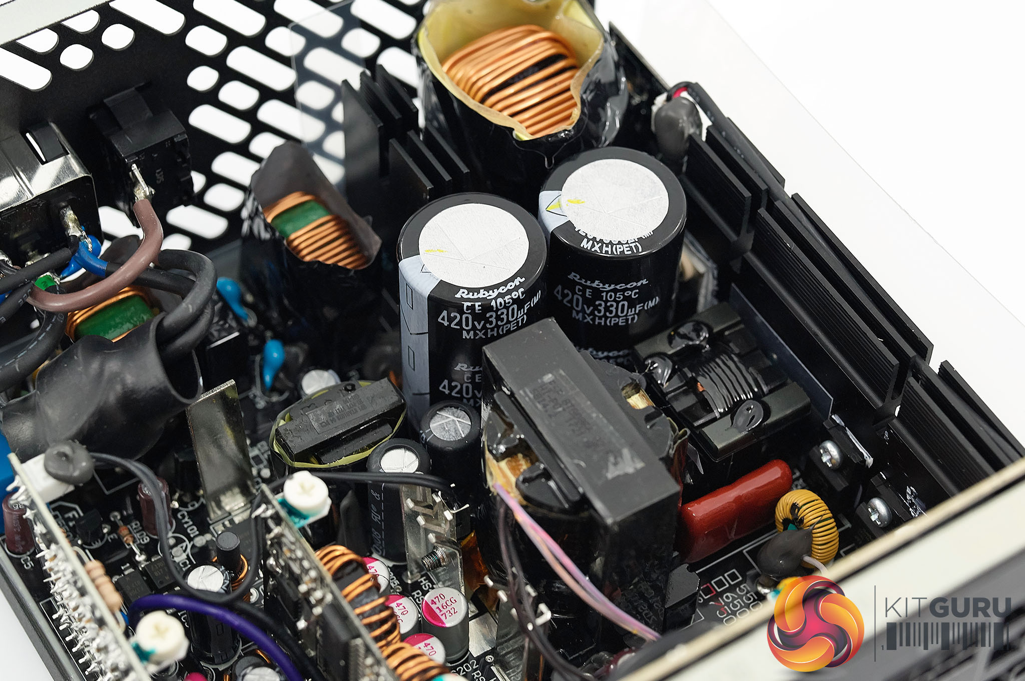 The primary side capacitors are by Japanese company Rubycon and are rated at 105c. Each capacitor is rated at 420V 330uf for a total of 660uF. Rubycon and Nippon Chemi Con are excellent Japanese caps for these kind of units, offering long term reliability.