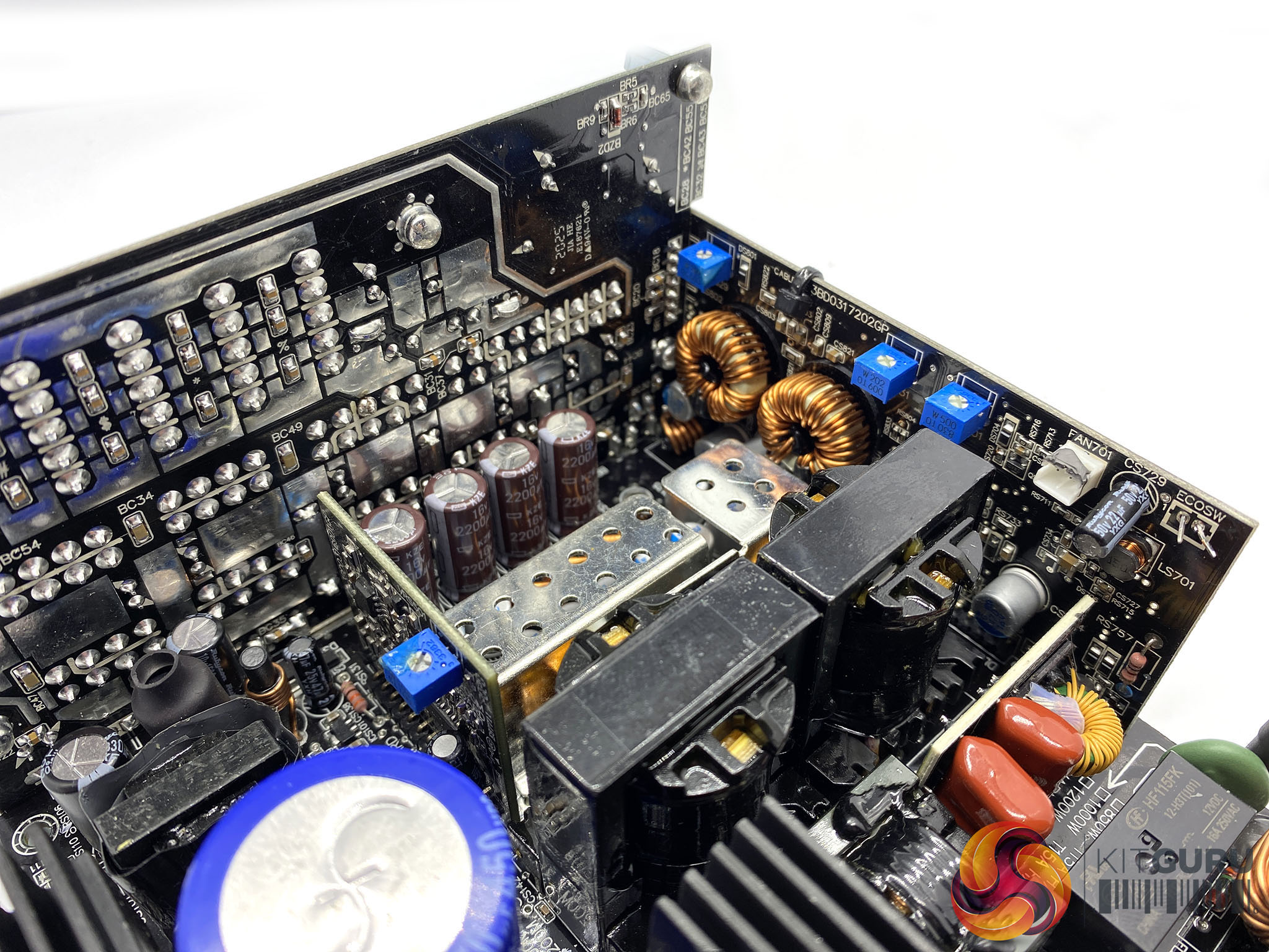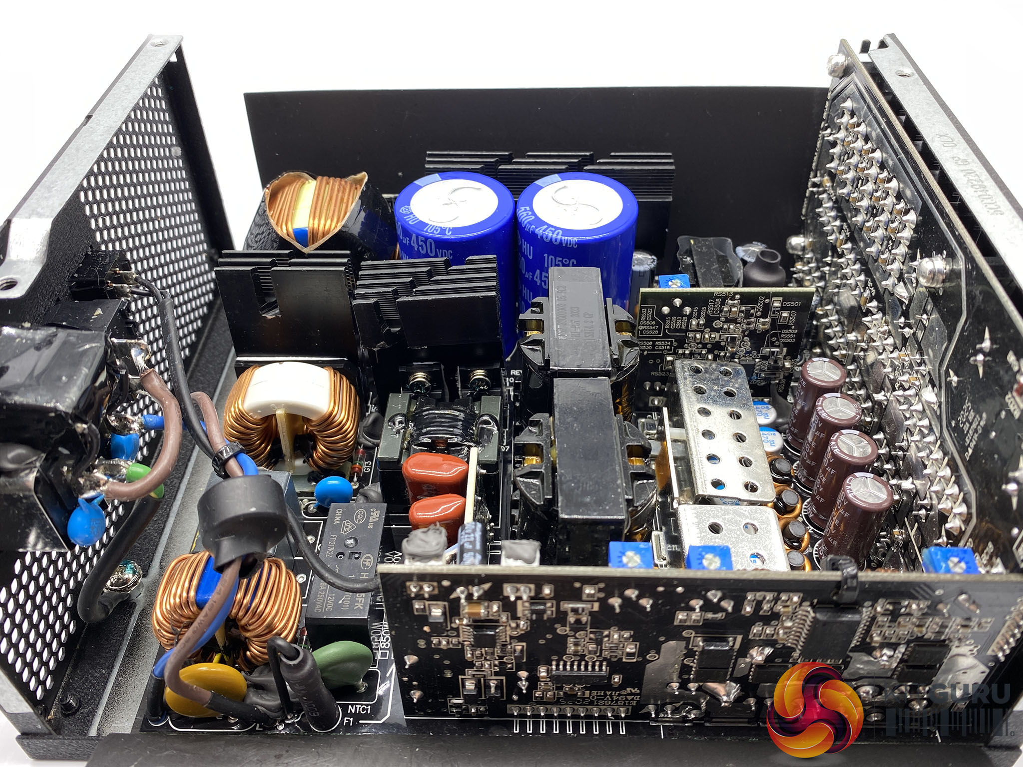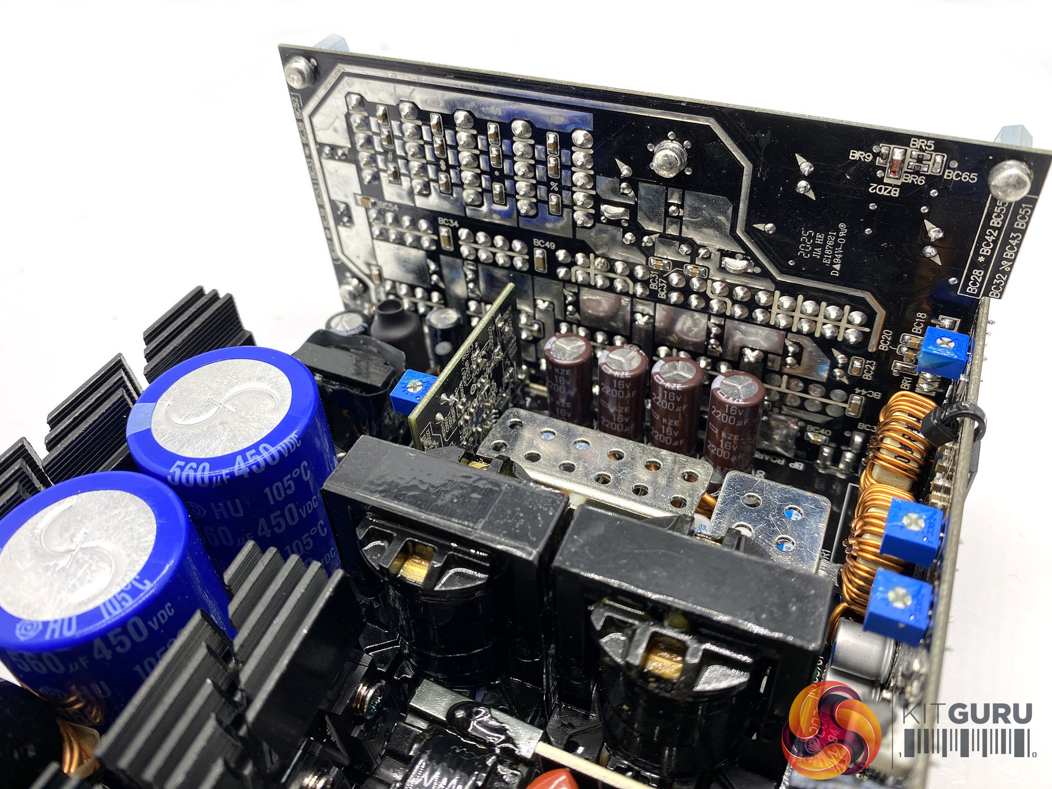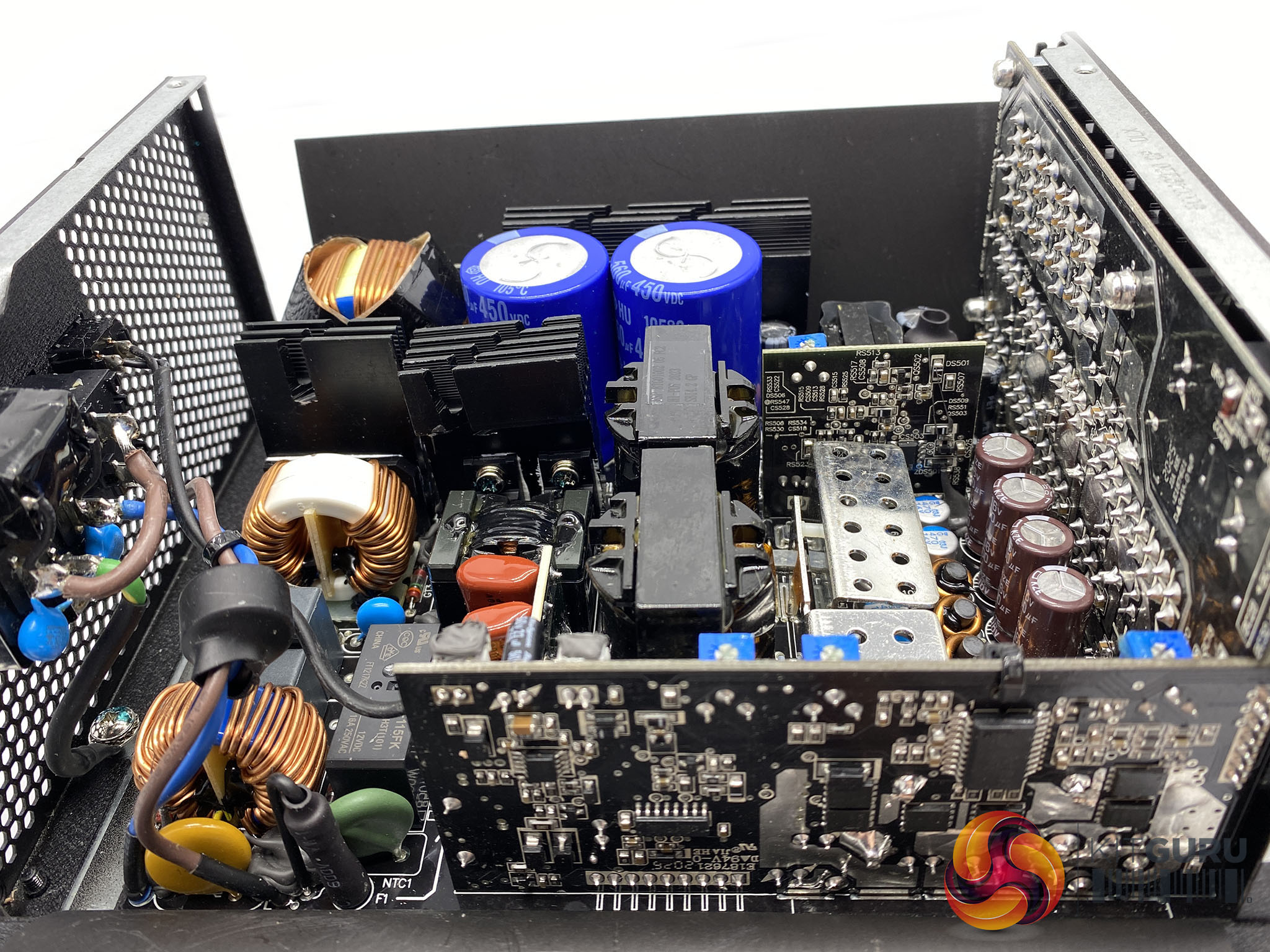 The primary stage capacitors are 105c rated and 450V 560uF for a monstrous combined 1120uF output. It offers OCP, OVP, SCP, OPP, UVP and OTP protections. Like some server PSU designs, FSP are using copper bars between the mainboard and the daughter cards to increase conversion efficiency.