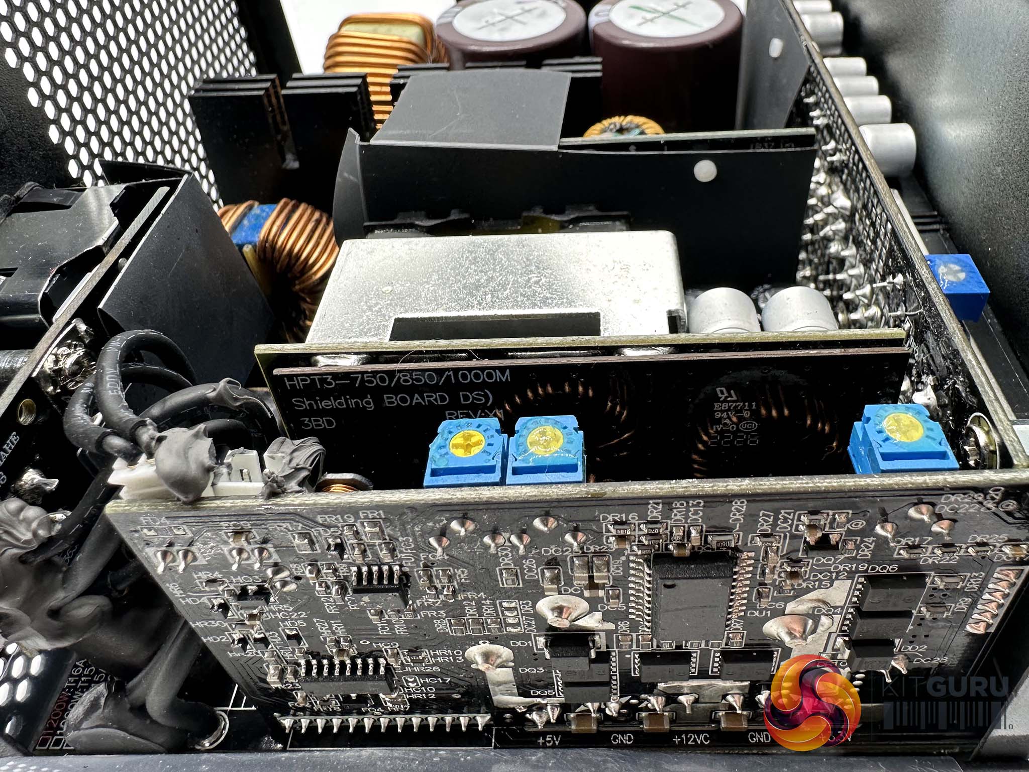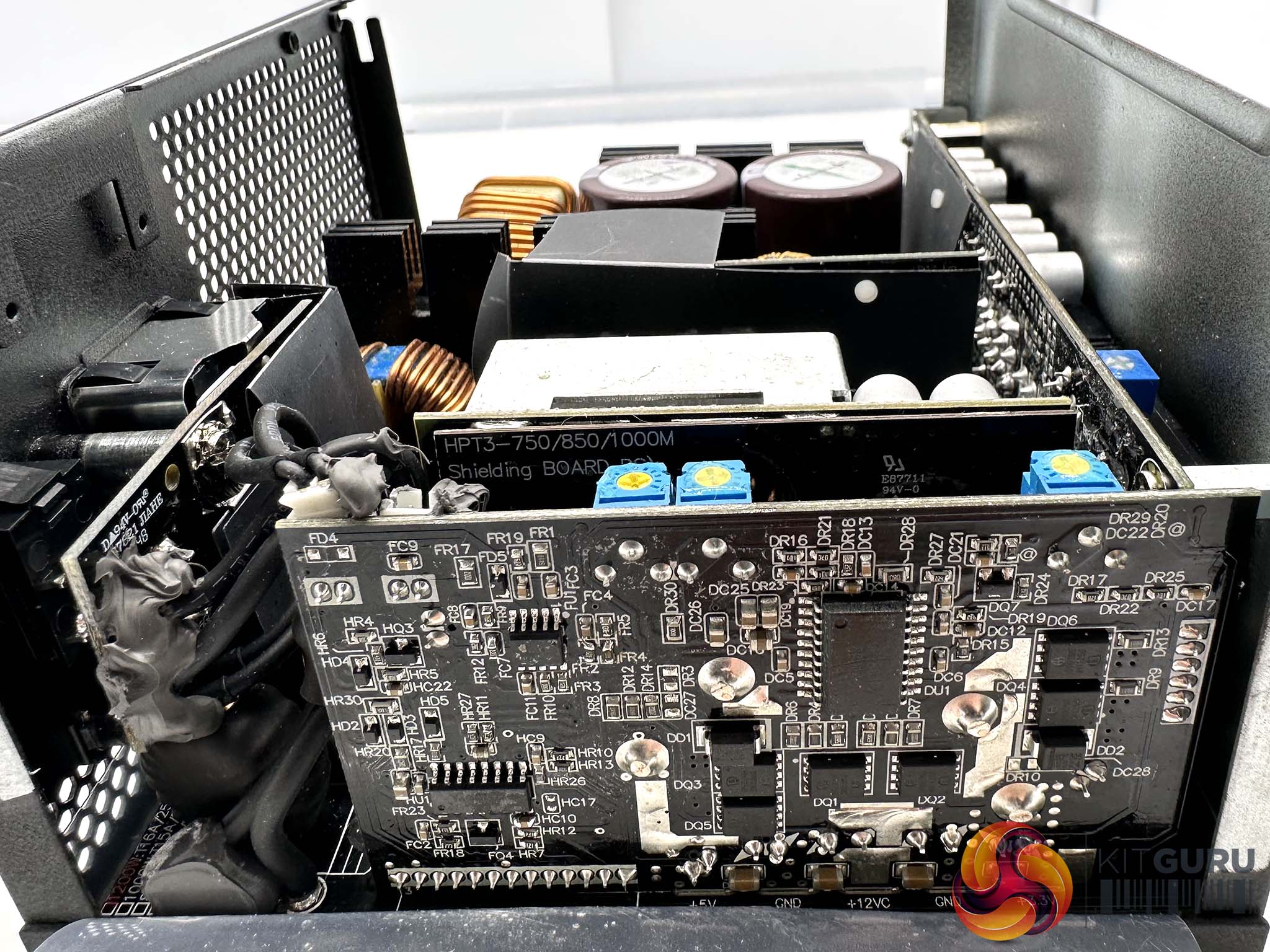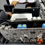 The secondary stage of the design is mounted on vertical PCBs. The two boards house the LLC resonant circuitry and the secondary rectification stage which includes the transformer. FPS are using very high grade Toshiba efficiency switchers to help achieve the rating. 3.3V and 5V lines are produced by DC-to-DC conversion – a standard practice for a design such as this.