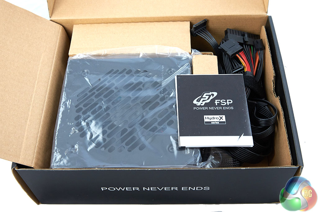 The FSP box artwork is almost identical to the Hydro G series unit we tested back in December 2015. The artwork is dark, with gold accenting on the edges and a photograph of the unit in the center. Some of the key selling points are listed along the bottom – such as 80 Plus Gold Certification, the DC to DC design and Japanese Caps.