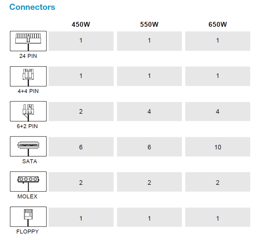 Above, a breakdown of the cable configuration, as well as the lengths. The X 650 has support for single and dual graphics cards configurations with 4 x PCIE 6+2 pin cables.